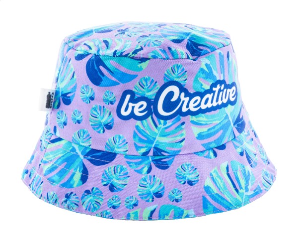 Pălărie din RPET, realizată la comandă, cu grafică imprimată prin sublimare pe toată suprafața. Poliester 600D RPET (220 g/m²) cu etichetă distinctivă RPET. MOQ: 25 bucăți / mărime. Disponibilă în 3 mărimi: S (⌀55cm pentru copii), M (⌀58cm) și L (⌀60cm).