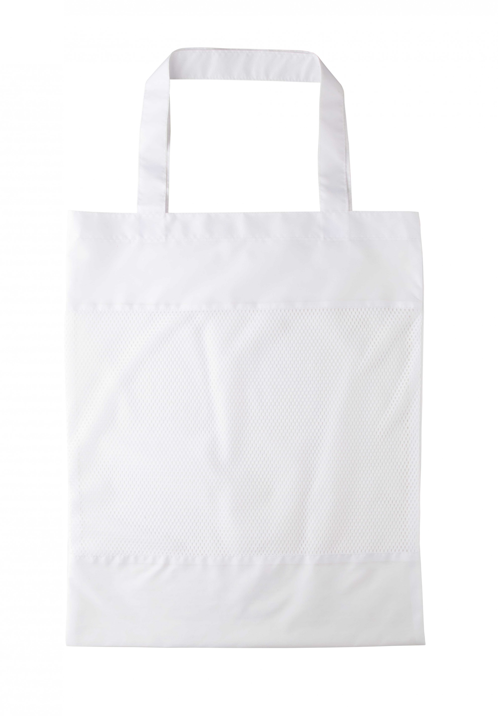 Sacoșă de cumpărături, personalizată, din poliester 190T, cu față din plasă de poliester și mânere lungi. Cu grafică imprimată pe toată suprafața prin sublimare (cu excepția părții din plasă). MOQ: 25 buc.