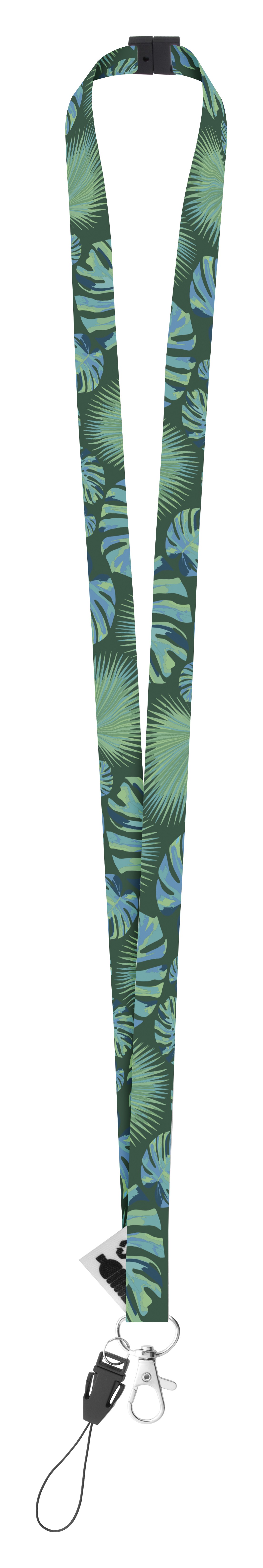 Lanyard de 15 mm latime, din RPET, cu carabina metalica, snur pentru telefon mobil si catarama de siguranta. Pretul include sublimarea pe ambele fete. Cantitate minima de comanda 100 buc.