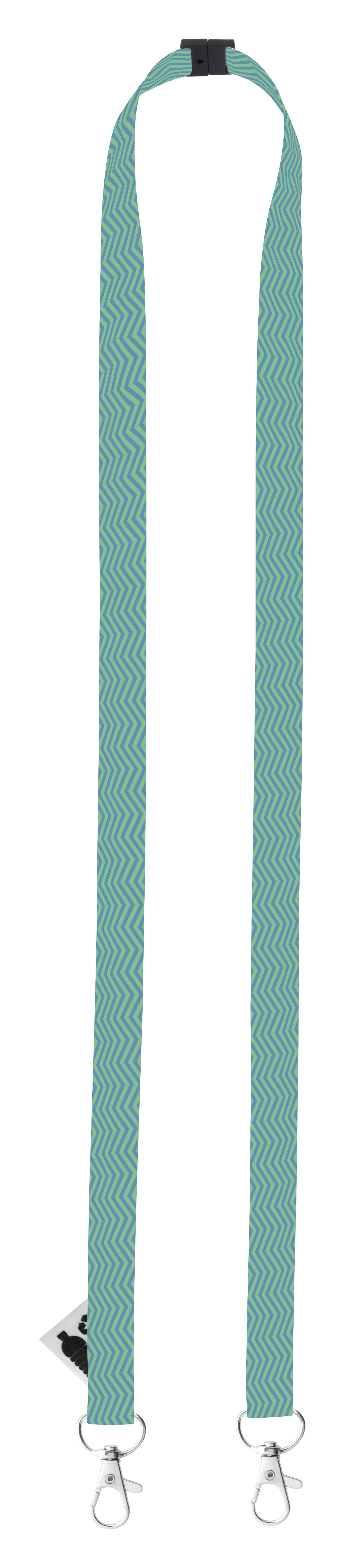 Lanyard de 15 mm latime, din RPET, cu 2 carabine metalice si catarama de siguranta. Pretul include sublimarea pe ambele fete. Cantitate minima de comanda 100 buc.