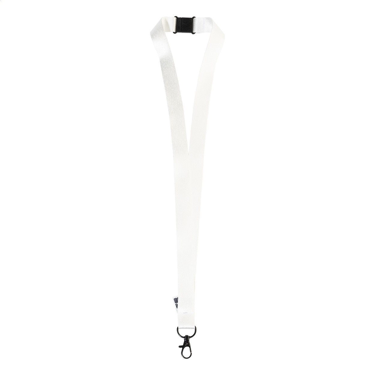 Lanyard RPET personalizat, cu carabină metalică colorată și cataramă de siguranță. Cu grafică imprimată prin sublimare pe ambele părți. Cantitate minimă de comandă: 100 bucăți.