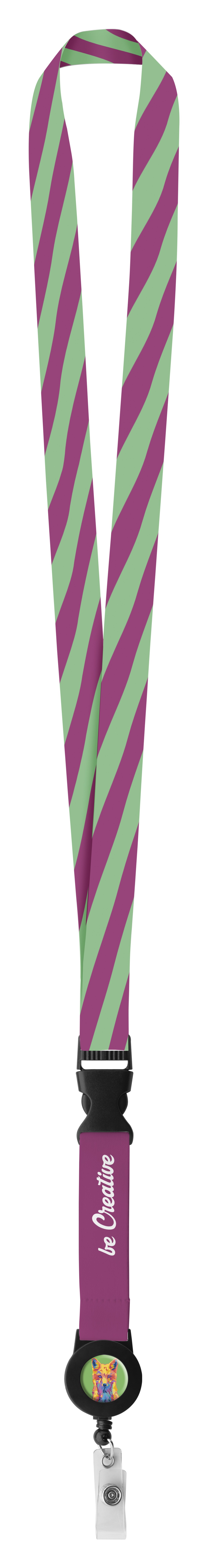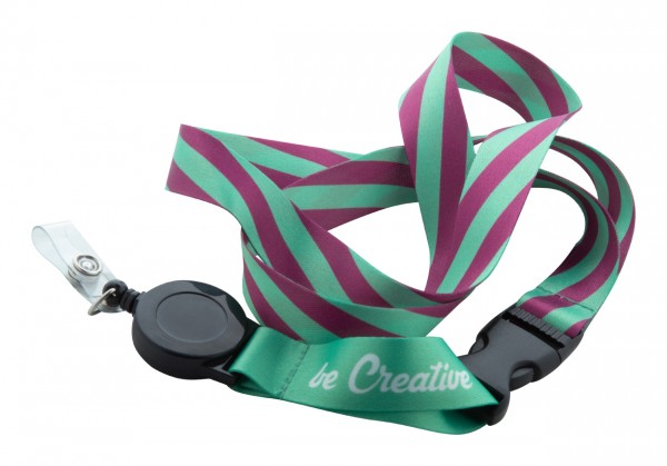 Lanyard din poliester cu suport telescopic detașabil pentru ecuson. Prețul include personalizarea cu sublimare pe ambele fețe. Cantitate minimă de comandă: 100 buc.