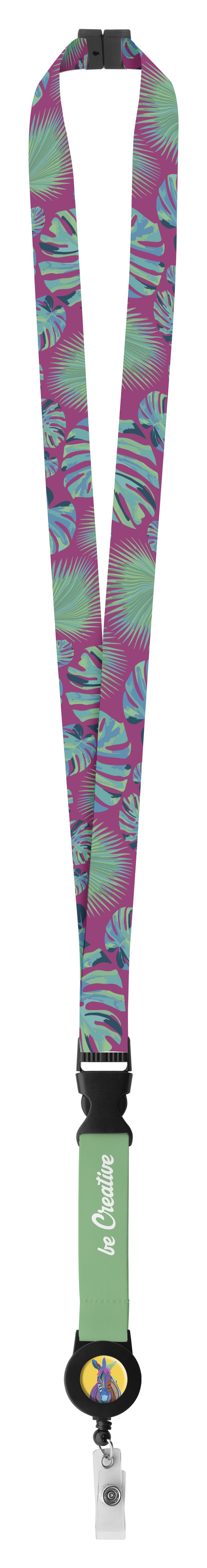 Lanyard din poliester cu suport telescopic detașabil pentru ecuson și cataramă de siguranță. Prețul include personalizarea cu sublimare pe ambele fețe. Cantitate minimă de comandă: 100 buc.