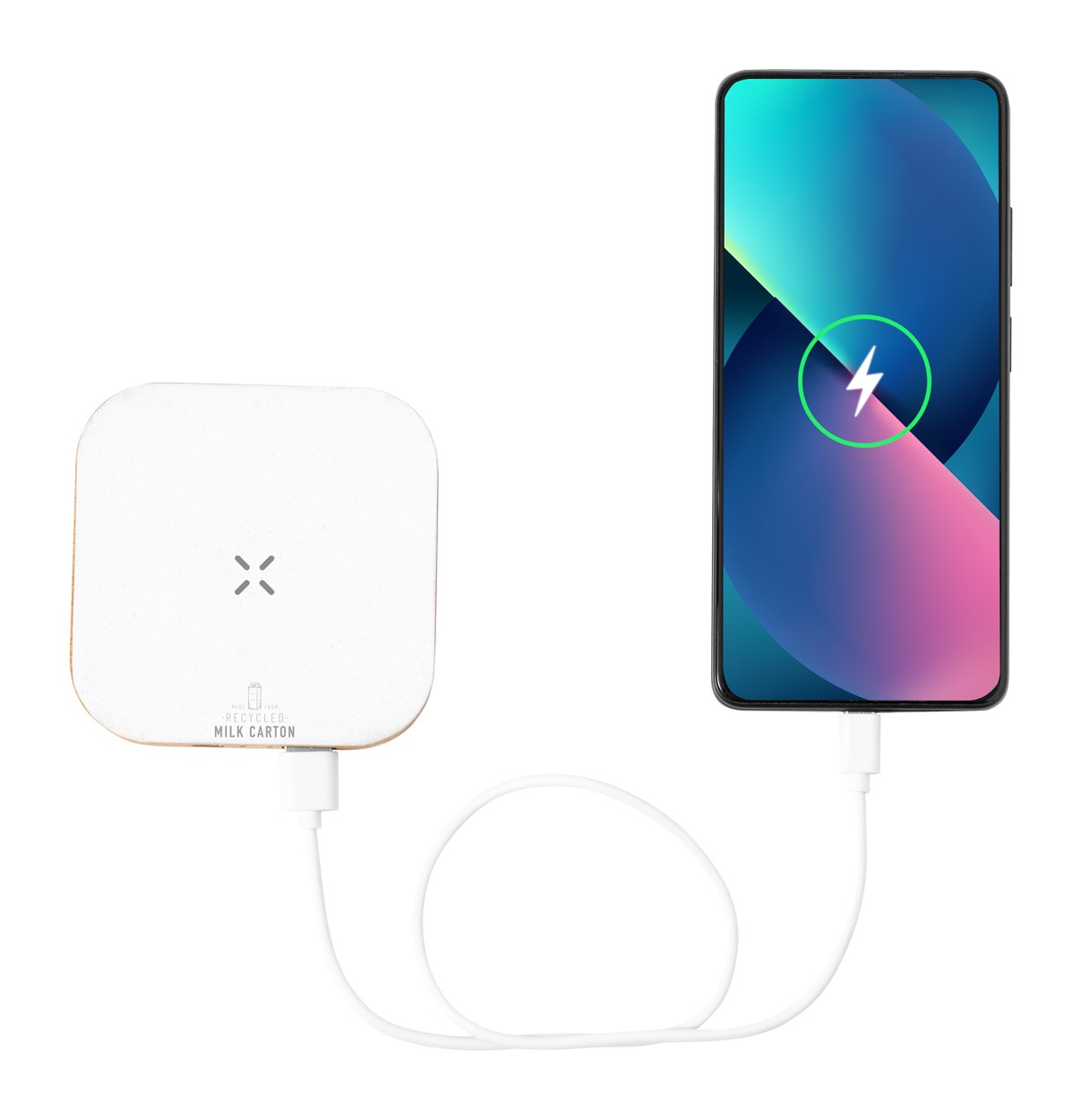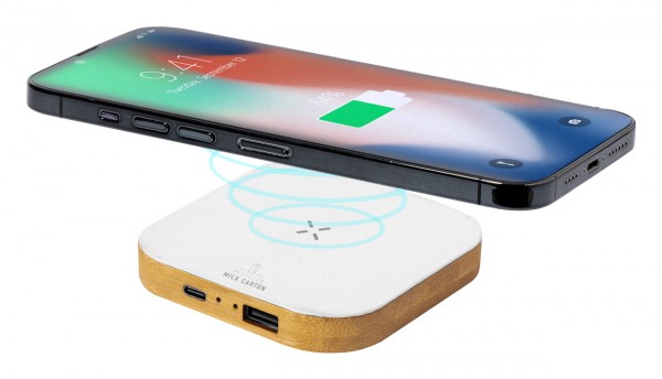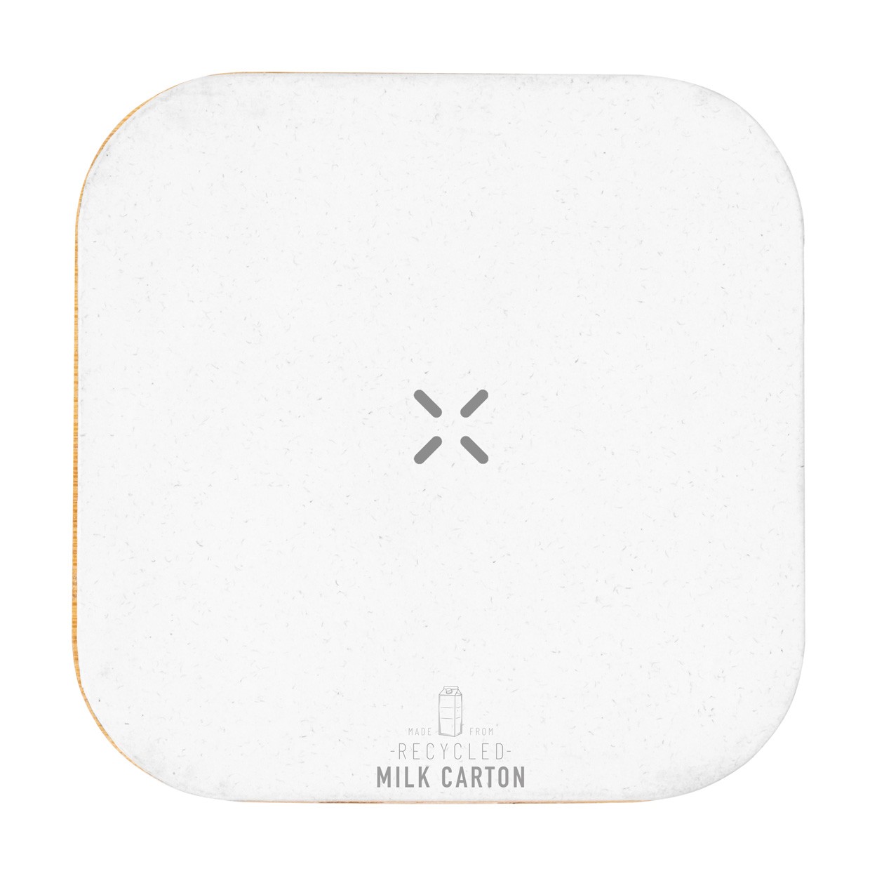 Wireless fast charger (15W) in recycled milk carton and bamboo. Including USB charger cable.