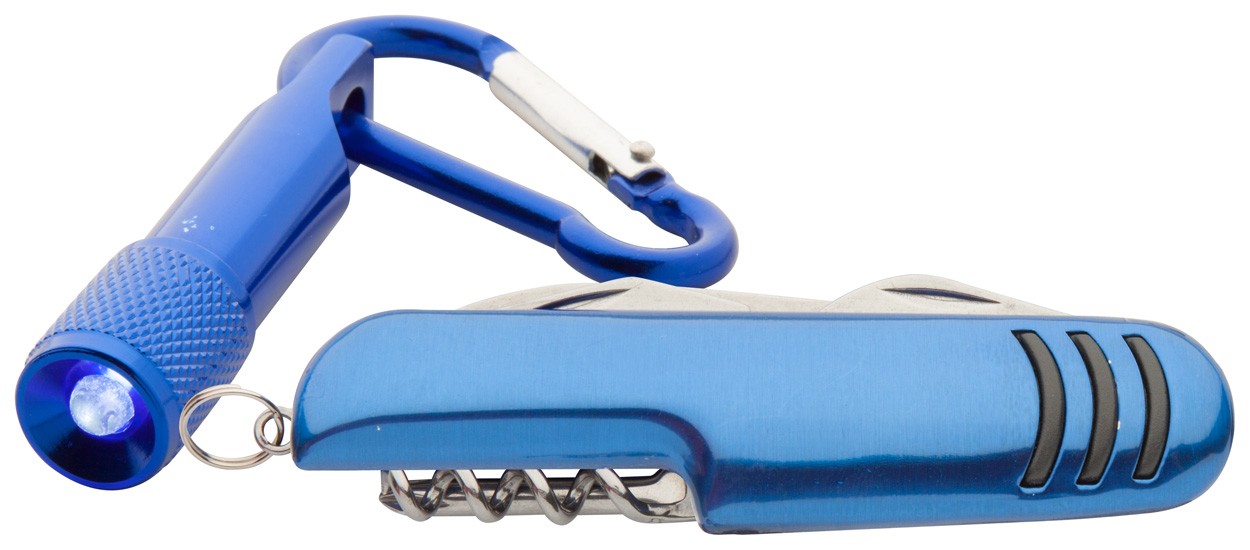 Briceag cu 7 funcţiuni, cu mini lampă din aluminiu, 1 LED, cu carabină, în cutie neagră de cadou.