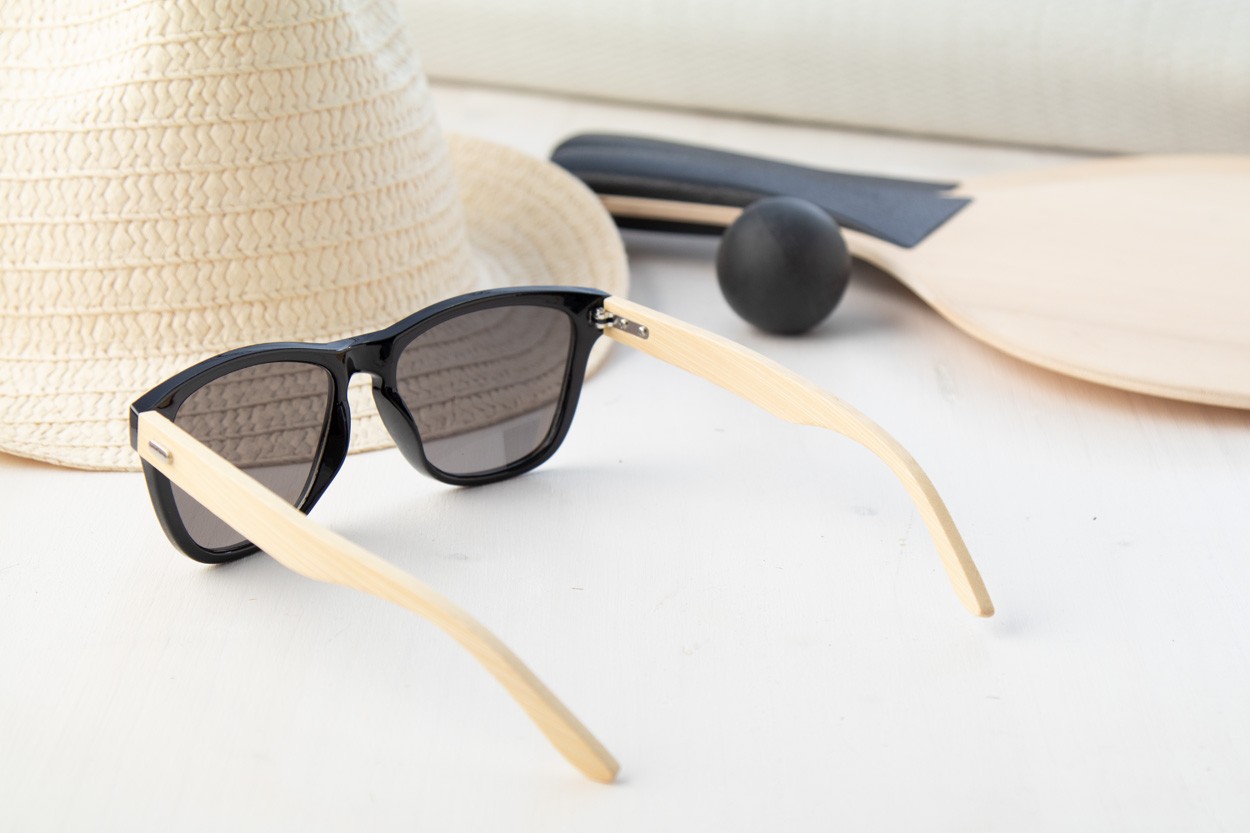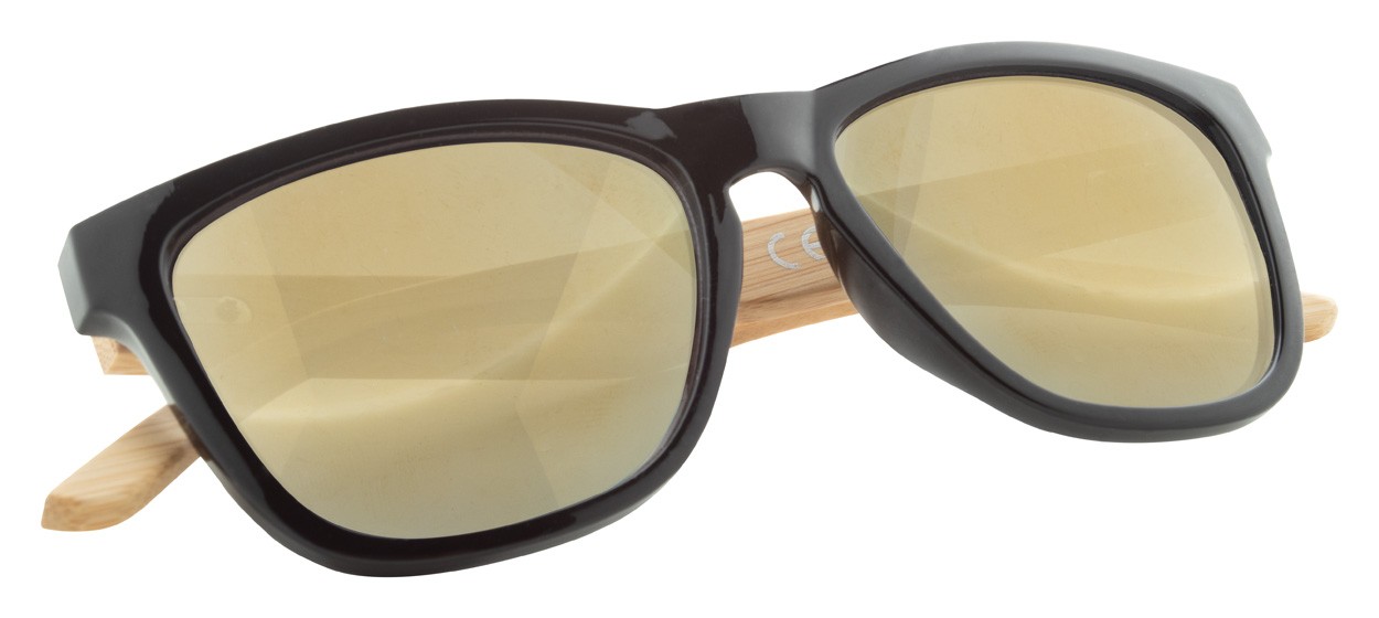 Ochelari de soare din plastic cu tâmple din bambus și lentile oglindite. Cu protecție UV 400.