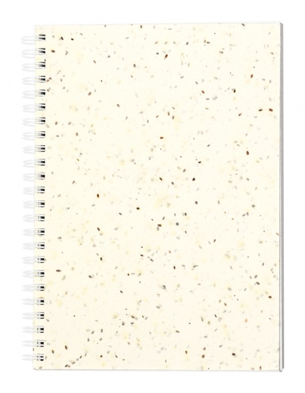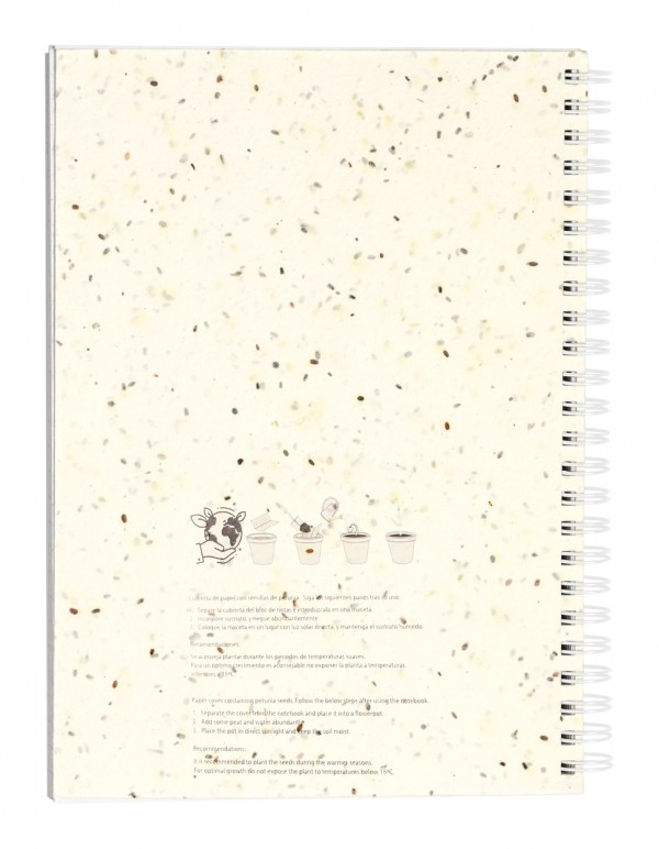 Caiet spiralat, acoperit cu hârtie cu semințe, cu 80 de foi veline. Coperta din hârtie cu semințe conține semințe de petunia în culori asortate, care pot fi plantate prin separarea coperții de caiet. Dimensiune A5.