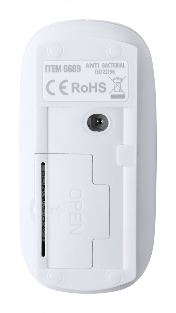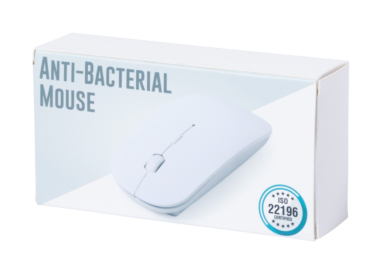 Mouse wireless din plastic antibacterian. Conform ISO 22196. Functioneaza cu 2 baterii AAA, se livreaza fara baterii.