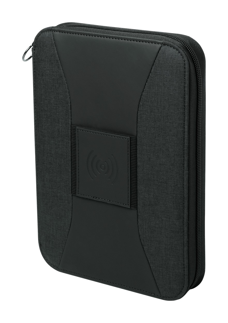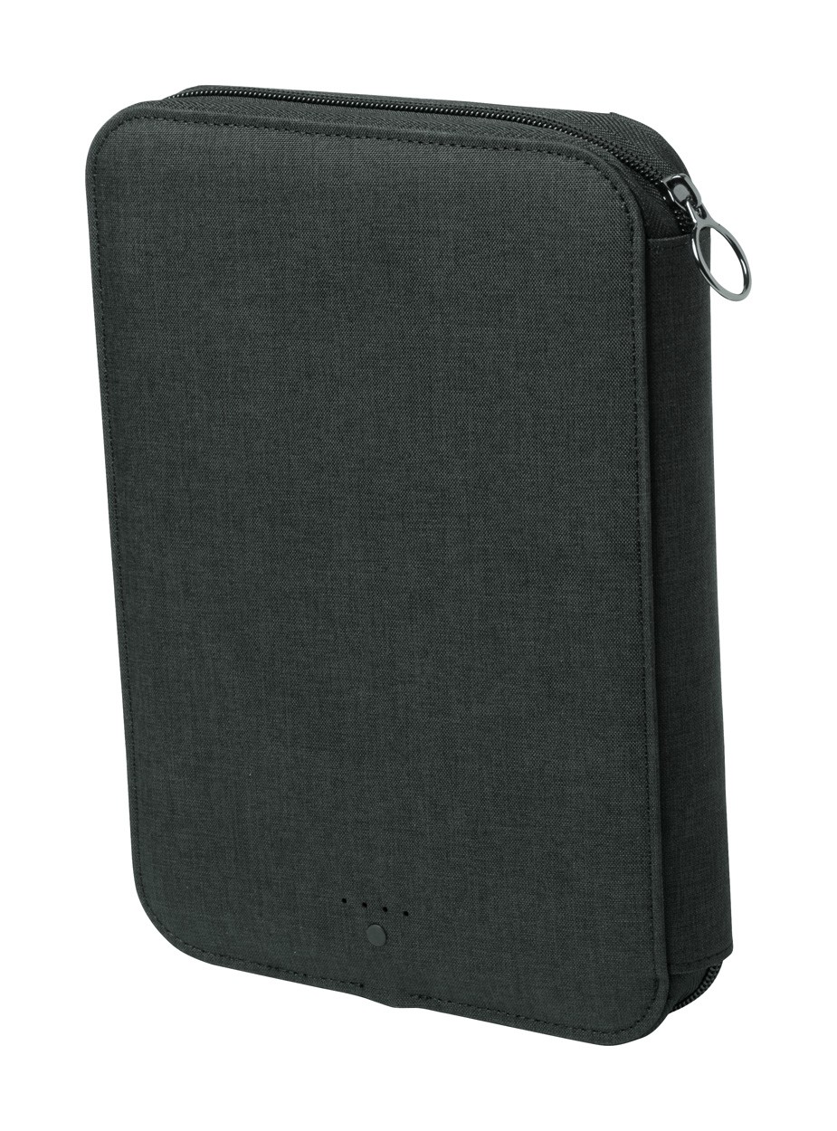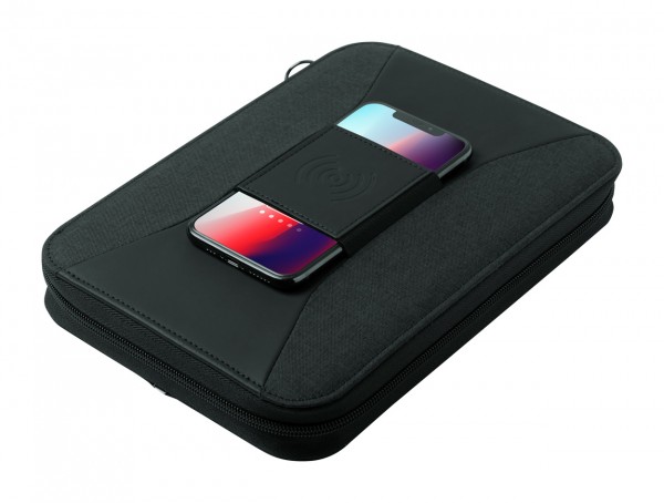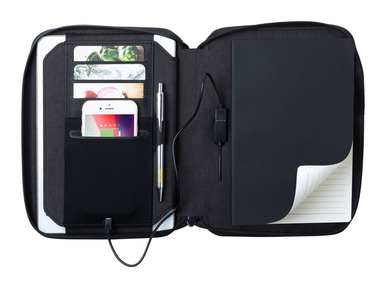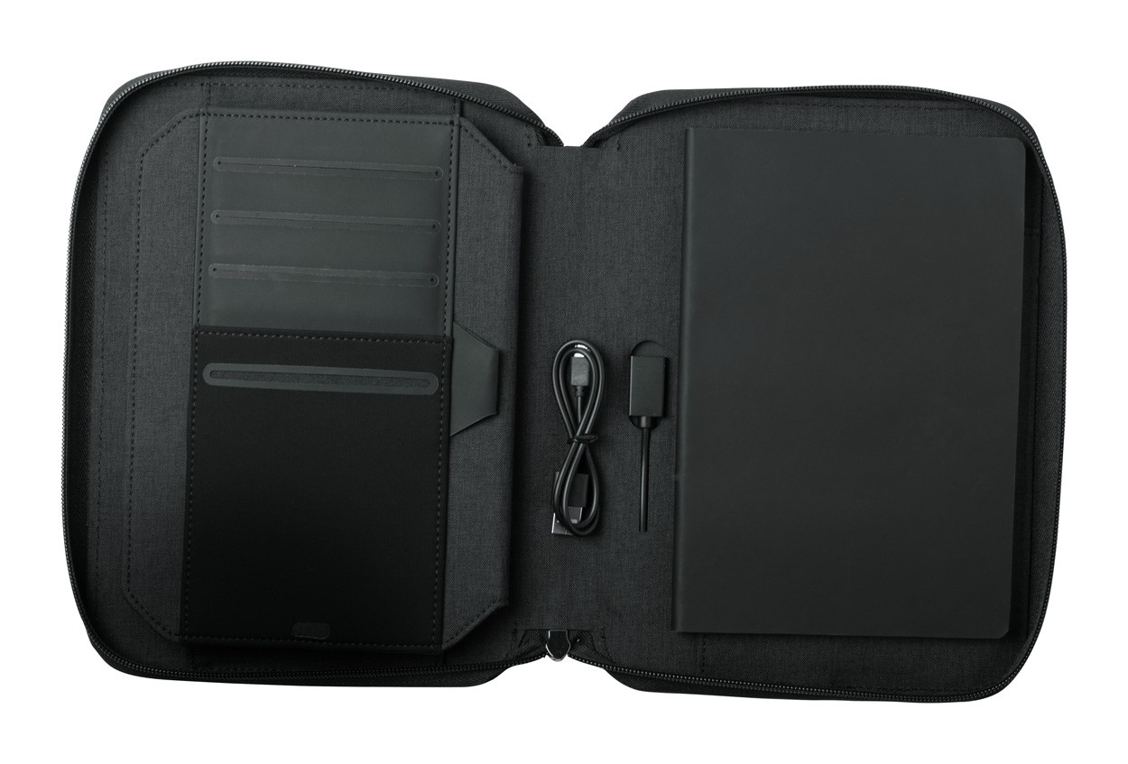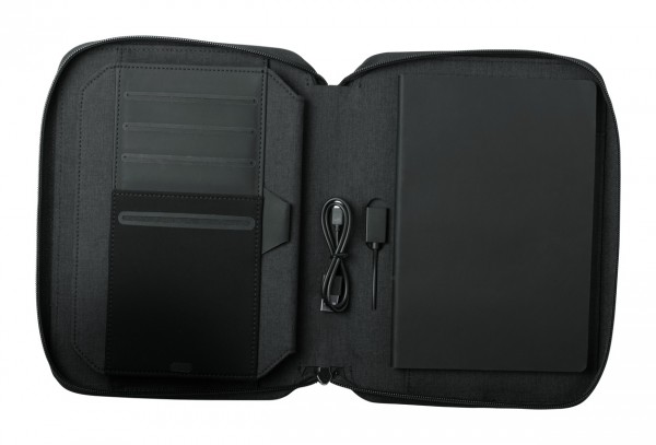 Mapă documente A5, poliester 300D și înlocuitor piele, cu power bank de 4000 mAh, încărcător wireless încorporat, carnețel dictando, 64 file. Cablu de încărcare USB inclus.