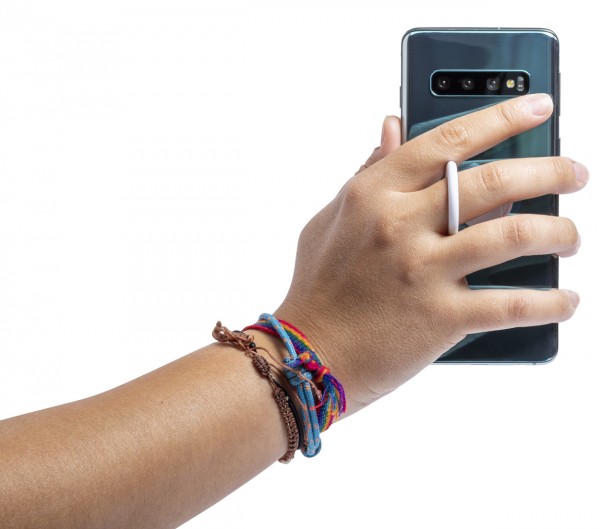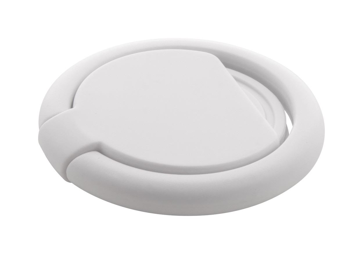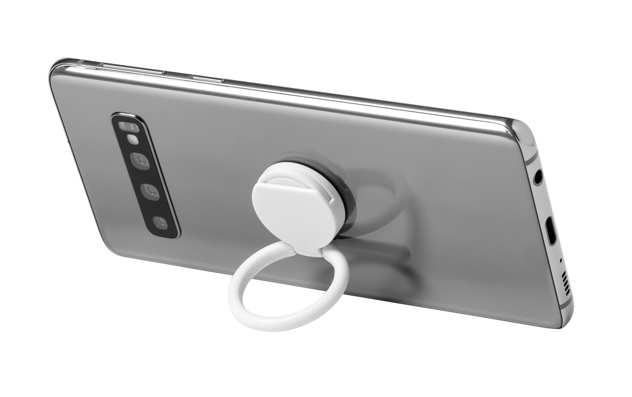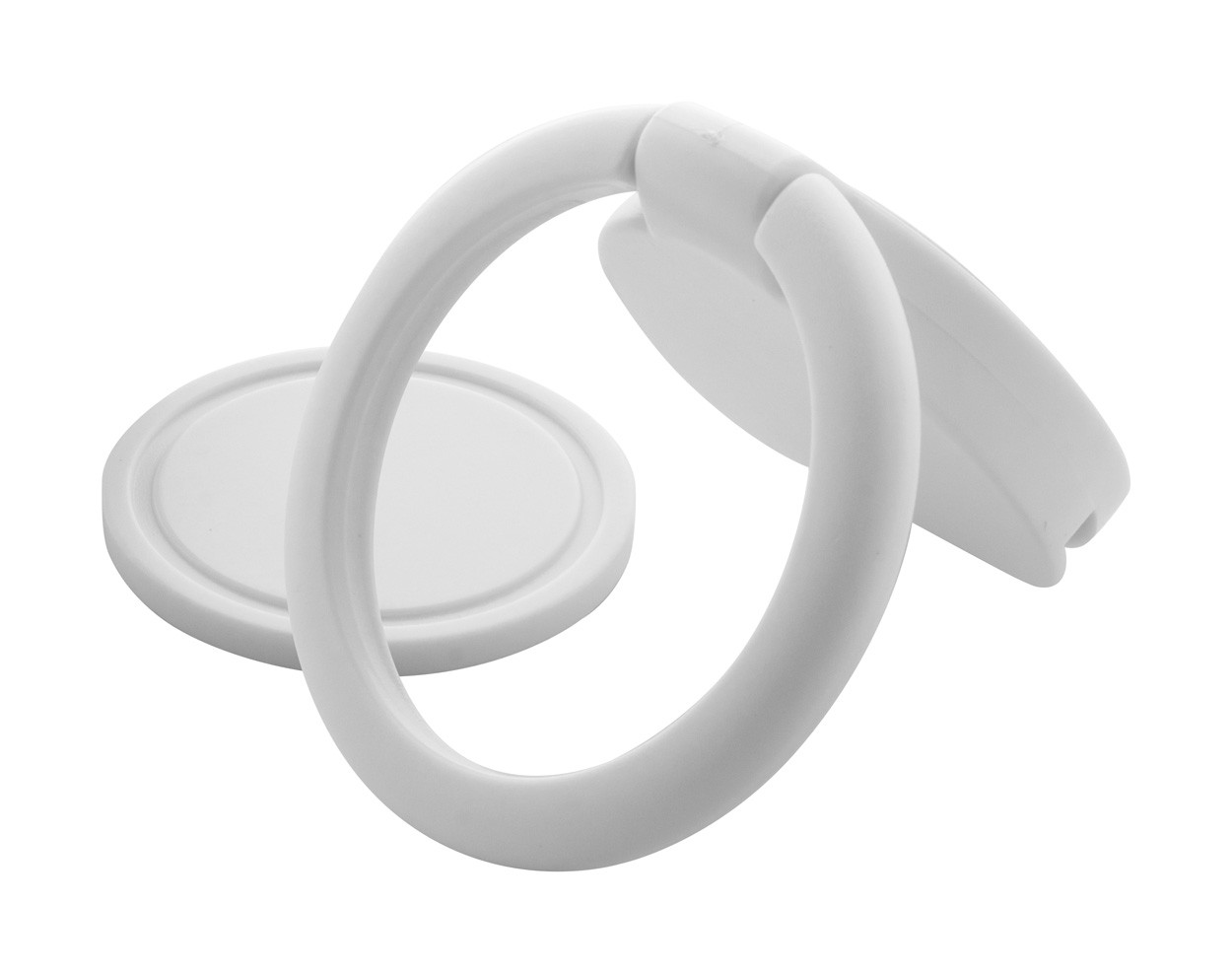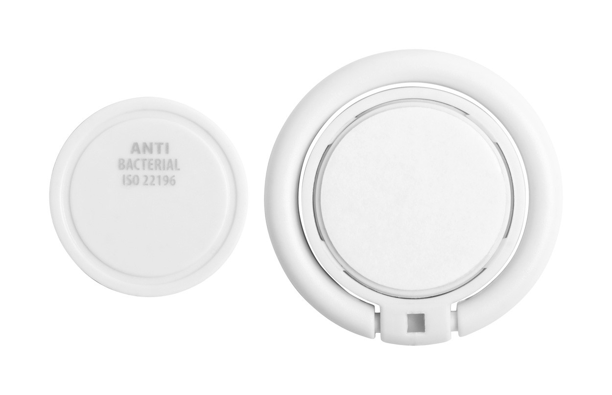 Suport inel pentru telefon mobil din plastic antibacterian, cu prindere autoadeziva si cu fisa pentru caruciori. Conform ISO 22196.