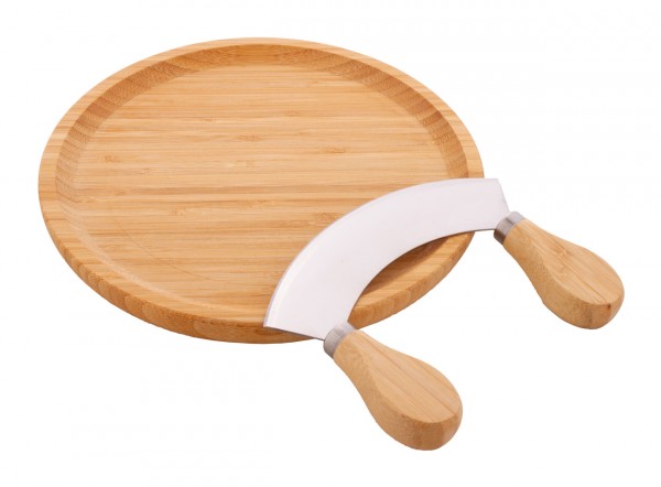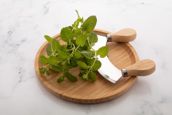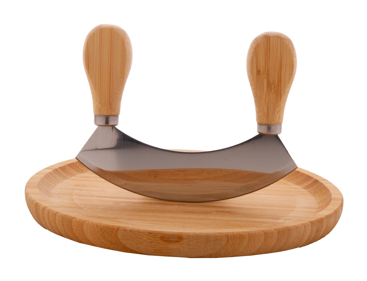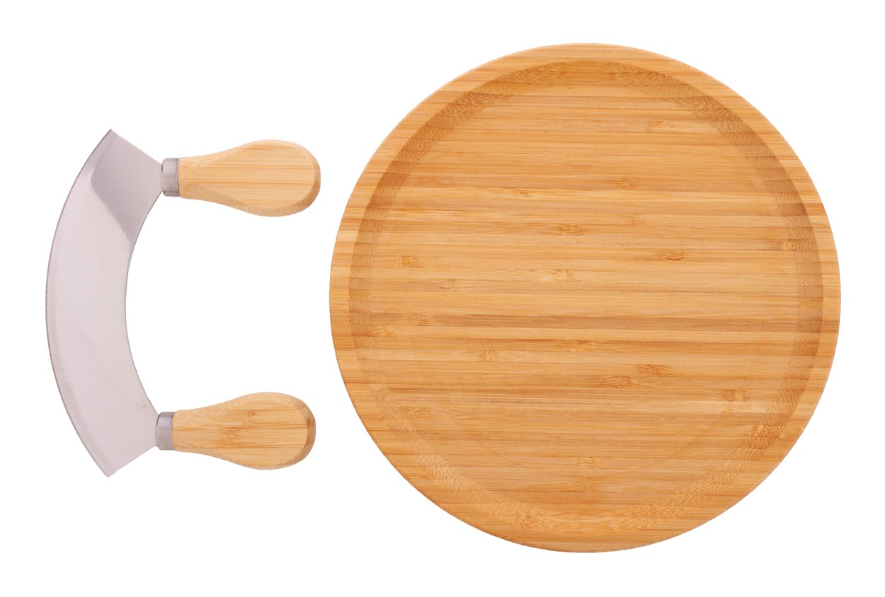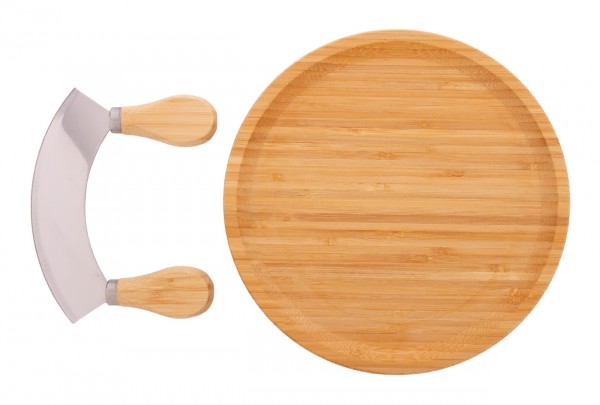 Set de tăiat ierburi, de bambus, care include o placă rotundă de tăiat din bambus și un tăietor de ierburi din oțel inoxidabil cu mânere din bambus.