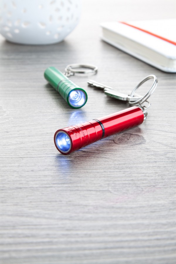 Lanternă mini din plastic, cu LED alb, inel din metal. Baterii incluse.