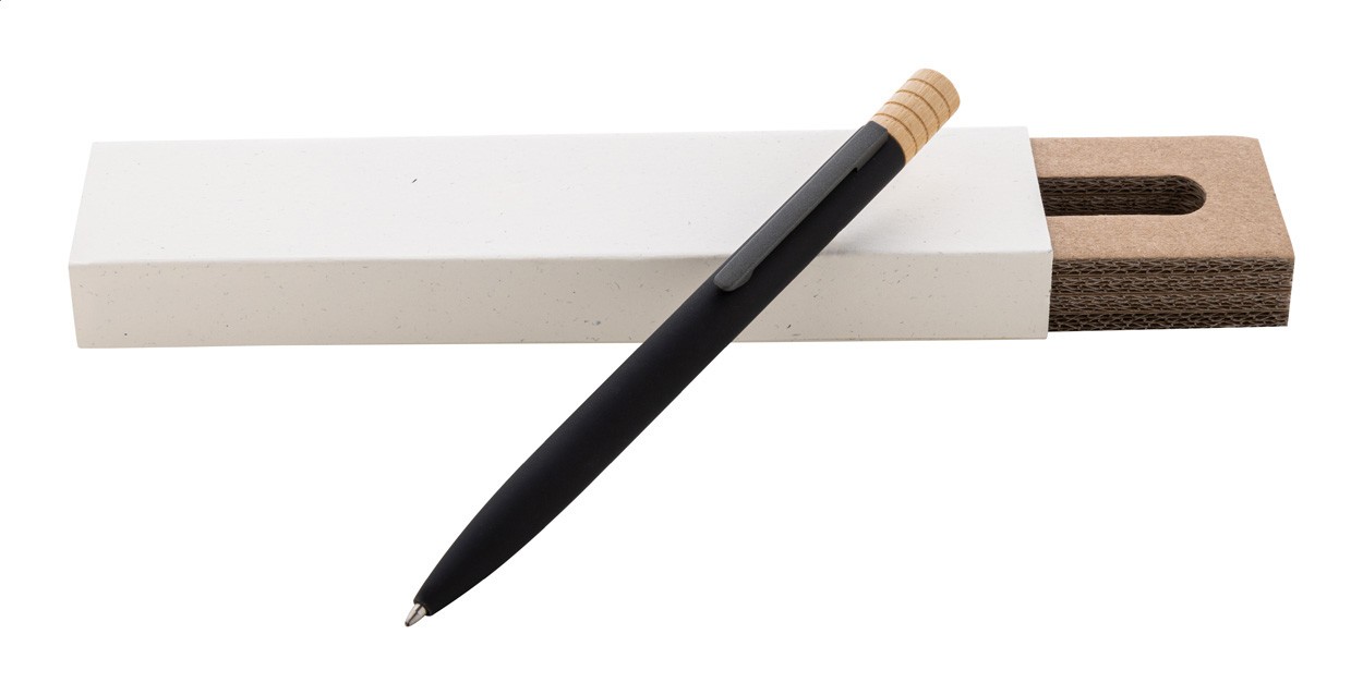 Pix din aluminiu reciclat, cu clemă cu finisaj gunmetal și vârf din bambus. Cu mină albastră. În cutie de hârtie kraft.