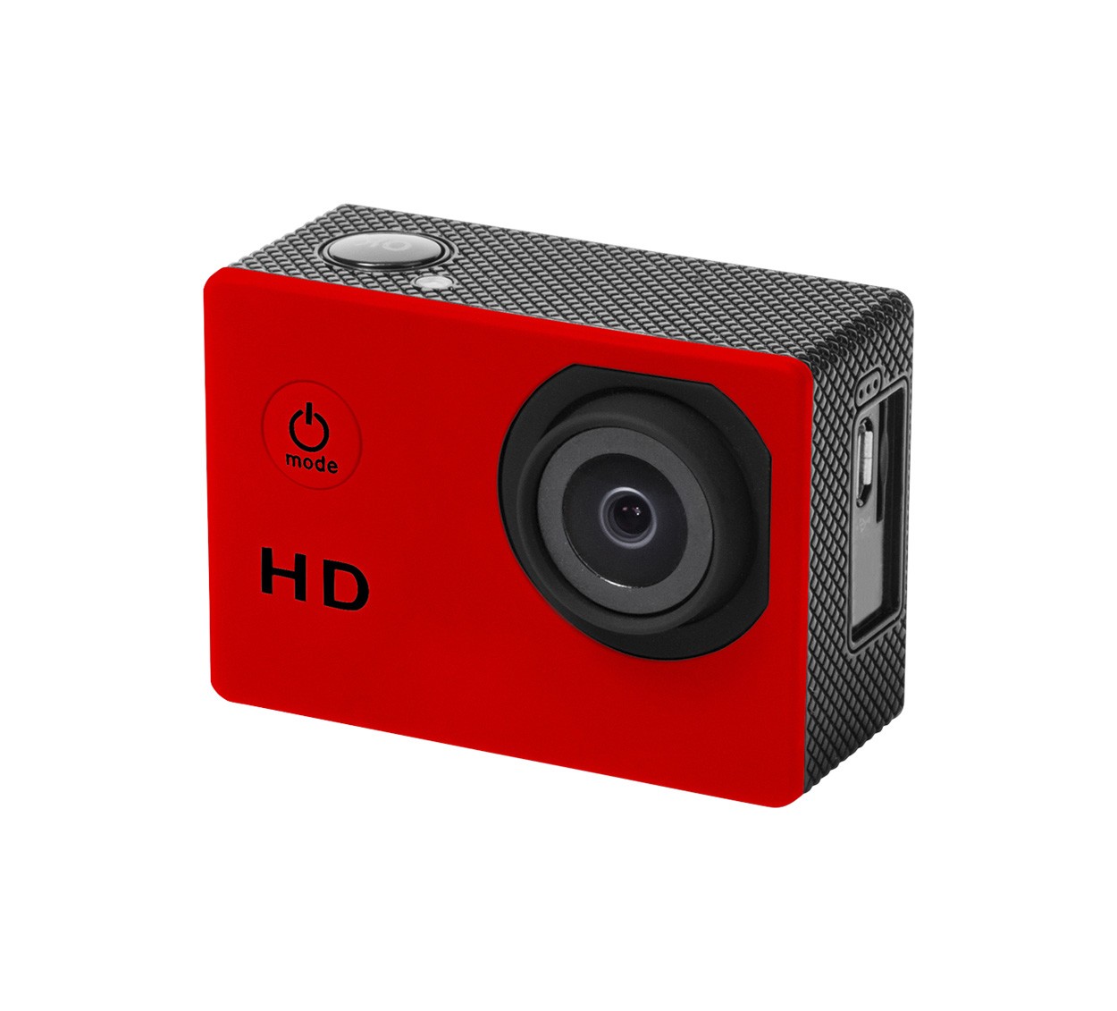 Cameră video sport din plastic, cu rezolutie HD 720p, 2 ", ecran LCD și baterie reîncărcabilă. 14 accesorii și cablu de încărcător USB.
