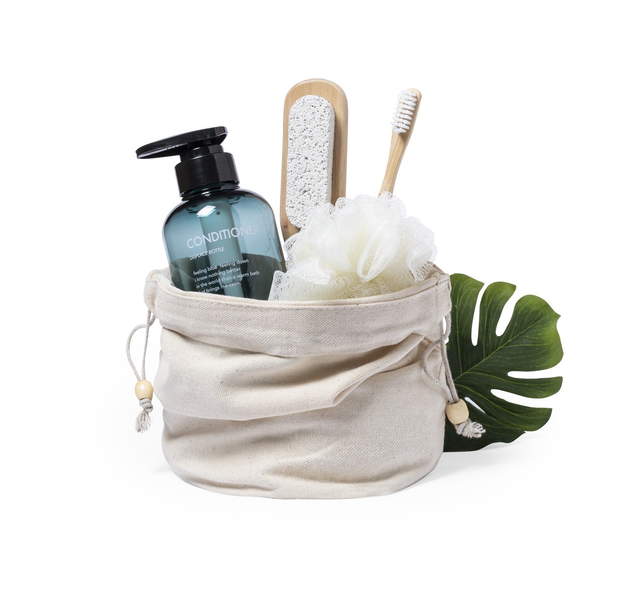 Sac de cosmetice din bumbac cu inchidere cu cordon si dopuri decorative din lemn. 100% bumbac, 230 g/m².
