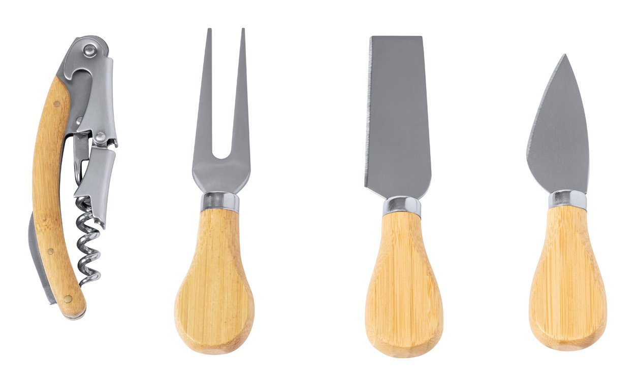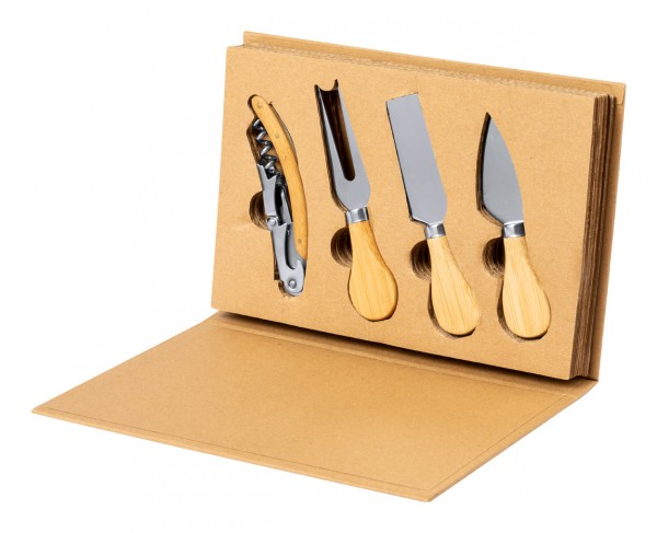Set de cuțite, 4 bucăți, pentru brânză, din oțel inoxidabil, mâner din bambus, în cutie din hârtie kraft reciclată în formă de carte. Include: tirbușon, 2 cuțite pentru brânză și furculiță pentru brânză.