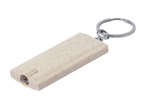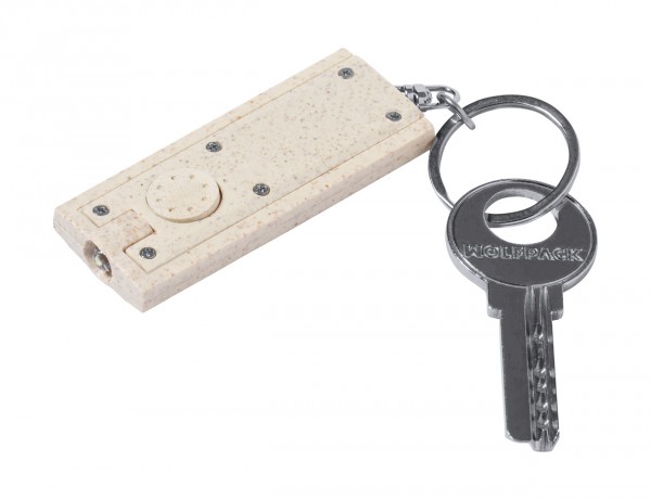 Breloc din plastic ecologic din paie de grâu, cu lanternă LED și inel metalic. Cu baterii tip buton