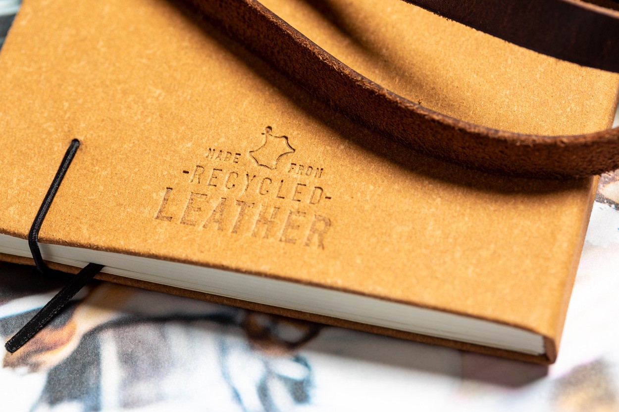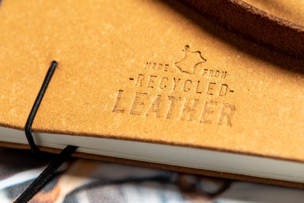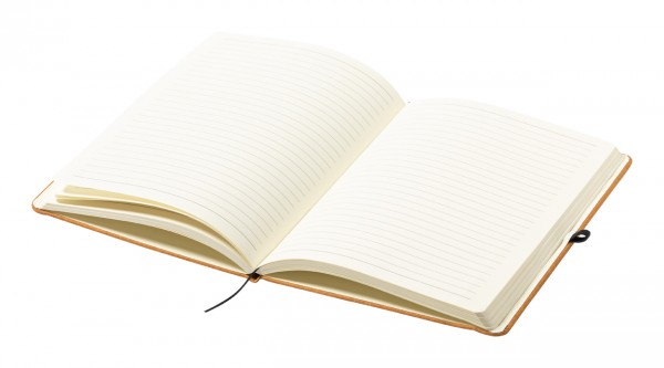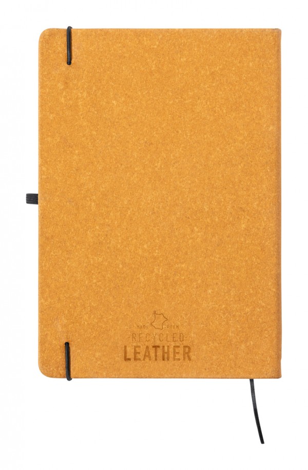 Caiet acoperit din piele reciclată, cu 100 de foi dictando, semn de carte și curea de cauciuc.