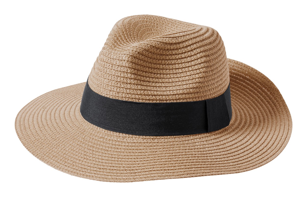 Pălărie de paie, unisex, din fibră sintetică, cu bandă decorativă pentru pălărie și bandă interioară reglabilă.