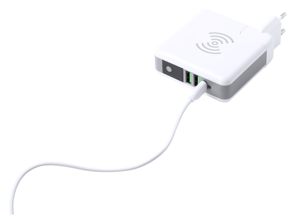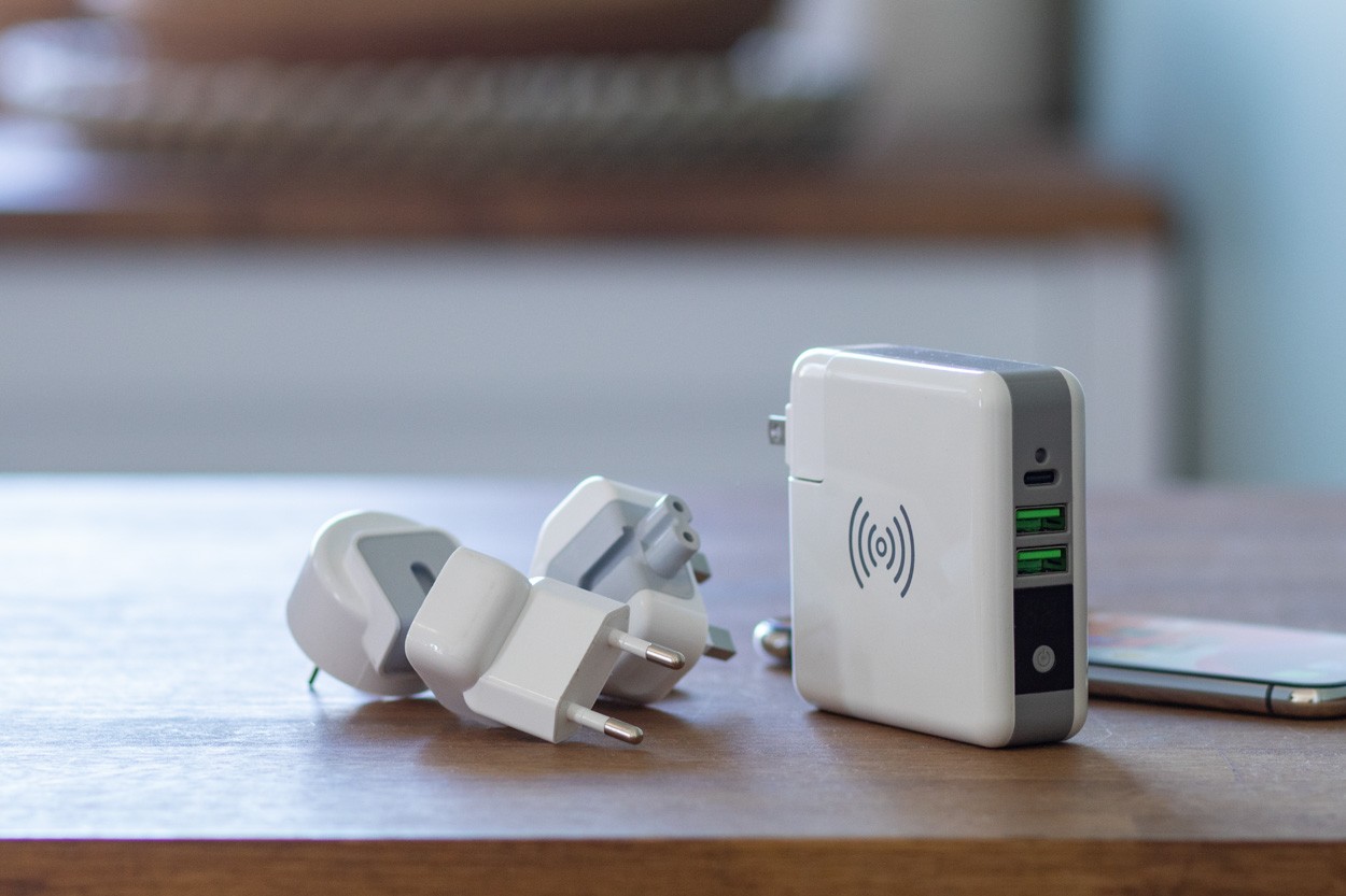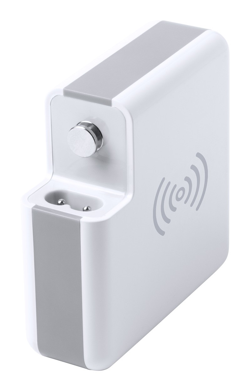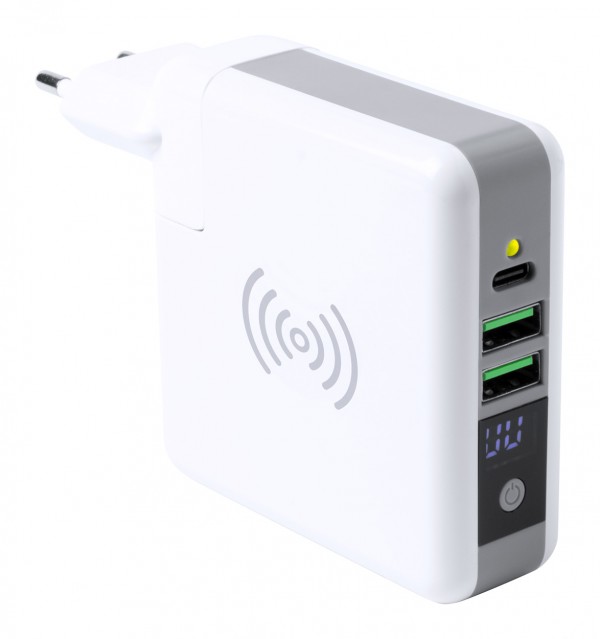 Powerbank multifuncțional / adaptor de călătorie cu prize de perete schimbabile pentru SUA, Europa, Marea Britanie și Australia. Cu baterie de 6700 mAh, încărcător wireless încorporat (5W), 2 porturi USB și 1 USB-C (ieșire max. 2400 mA) pentru încărcător.