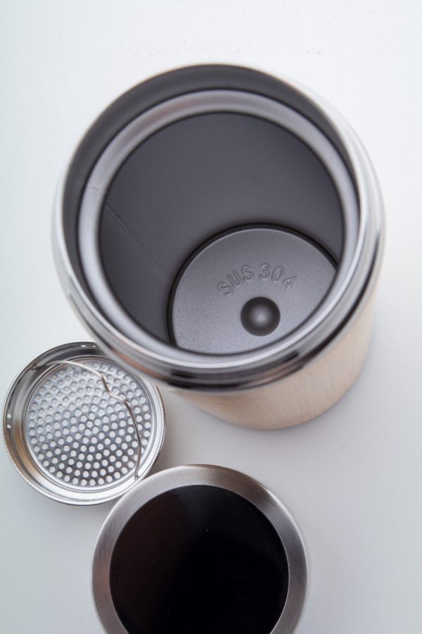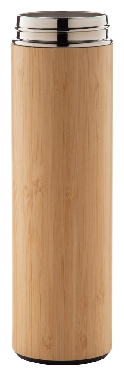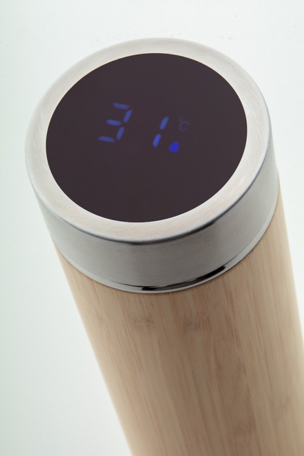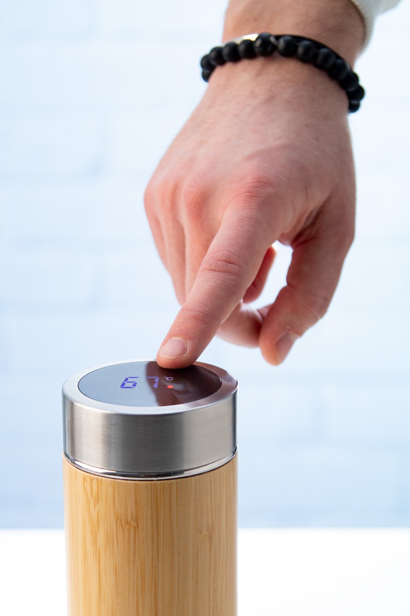 Termos cu perete dublu din oțel inoxidabil și bambus, cu infuzor de ceai și termometru cu LED-uri pe capac. 450 ml. Cu baterie tip baterie de ceas.