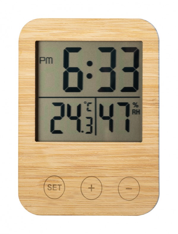 Ceas digital si stație meteo din bambus cu afișaj temperatură și umiditate.Funcționează cu 2 buc baterii AAA. Se livrează fără baterii.