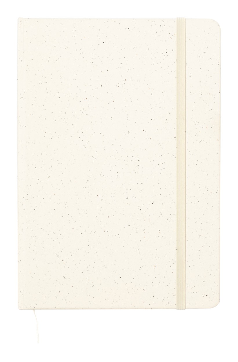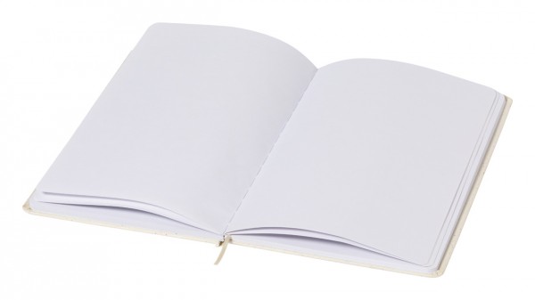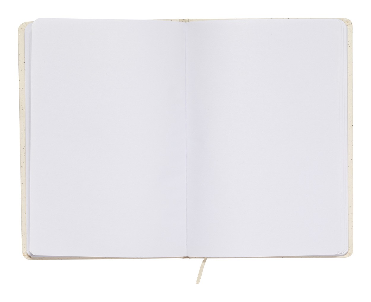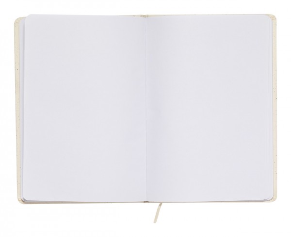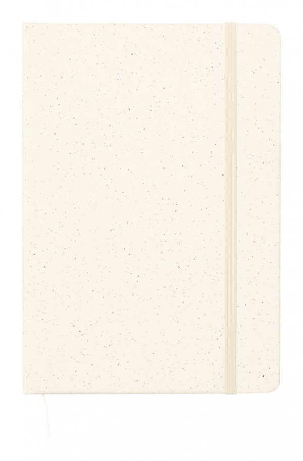 Caiet cu copertă din carton reciclat, cu 100 de foi veline. Cu semn și bandă de cauciuc. Dimensiune A5.