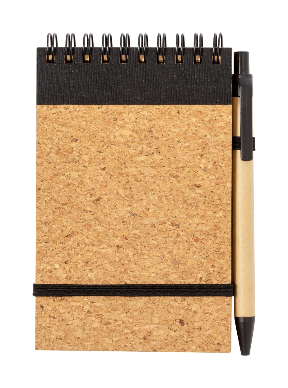 Caiet spiralat, acoperit cu plută naturală, cu curea de cauciuc, suport pentru pix și 80 de foi dictando, din hârtie kraft reciclată. Inclusiv pix din hârtie reciclată cu mină albastră.