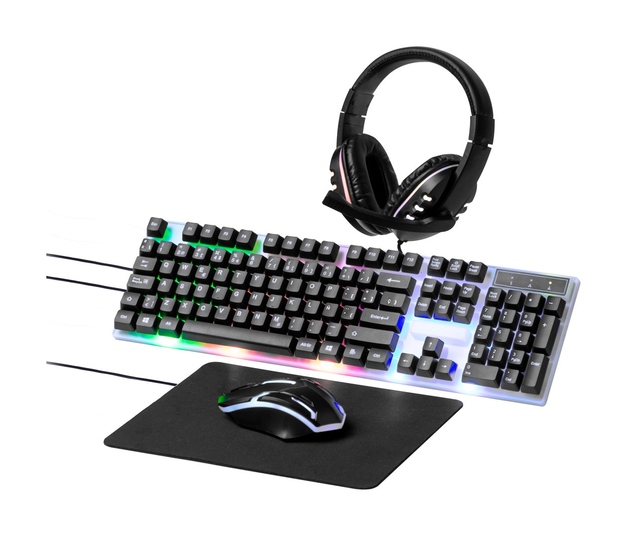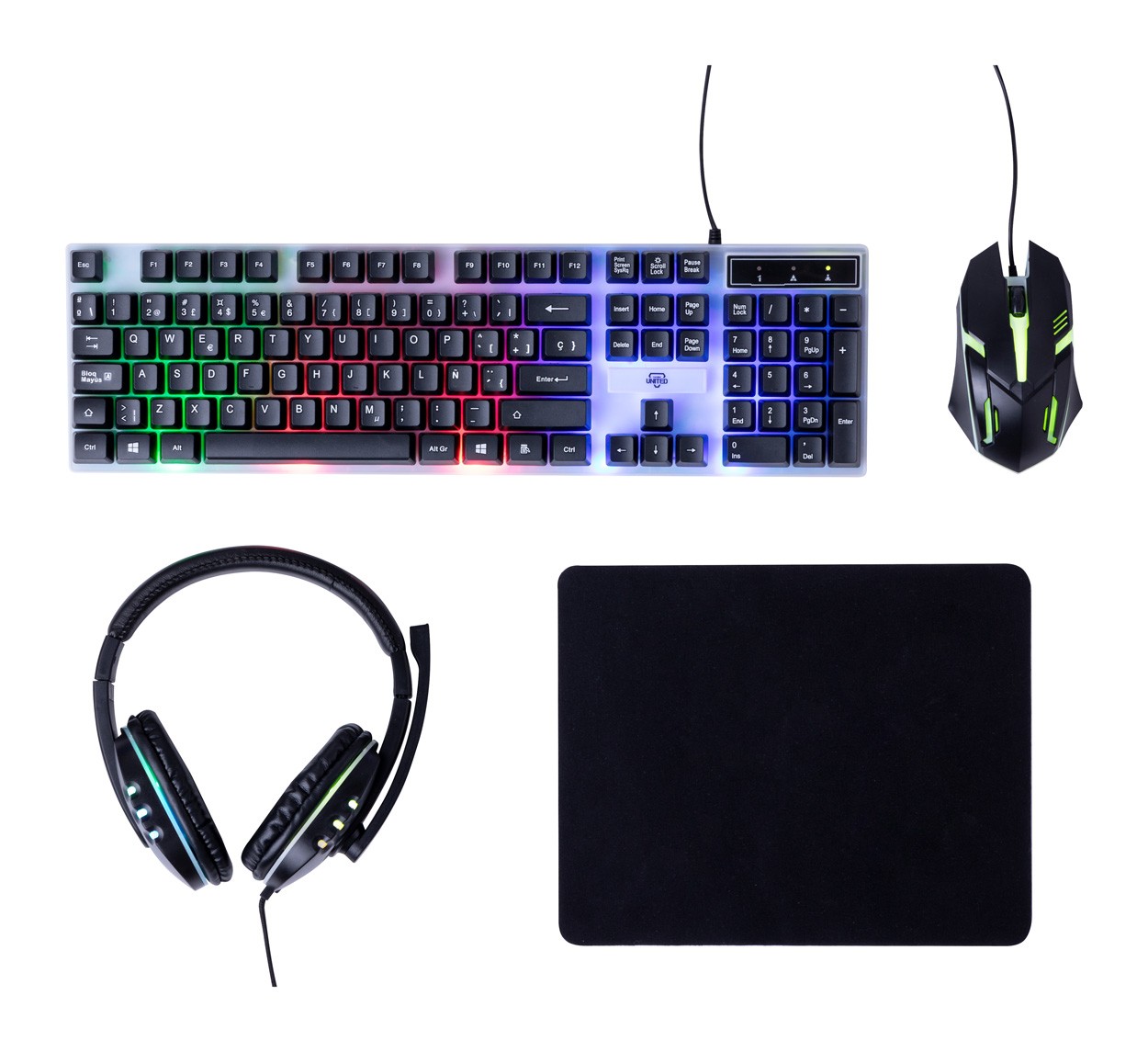 4 pc gamer set. Including 1 optical mouse, 1 polyester mousepad with anti-slip silicone base, 1 Spanish keyboard with multicolour LED lights and 1 headphone with jack connection.