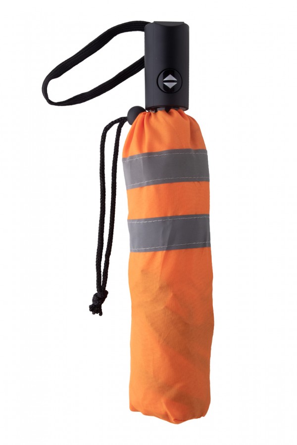 Umbrelă complet automată (deschidere / închidere), pliabilă, anti-vânt, cu 8 panele, ornamente reflectorizante. Cadru din aluminiu, spițe din fibră de sticlă și mâner din metal/plastic. În husă cu dungi reflectorizante. Pongee 190T. Numai pentru uz promoțional, produsul nu se califică drept Echipament de protecție personală.