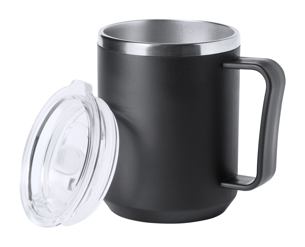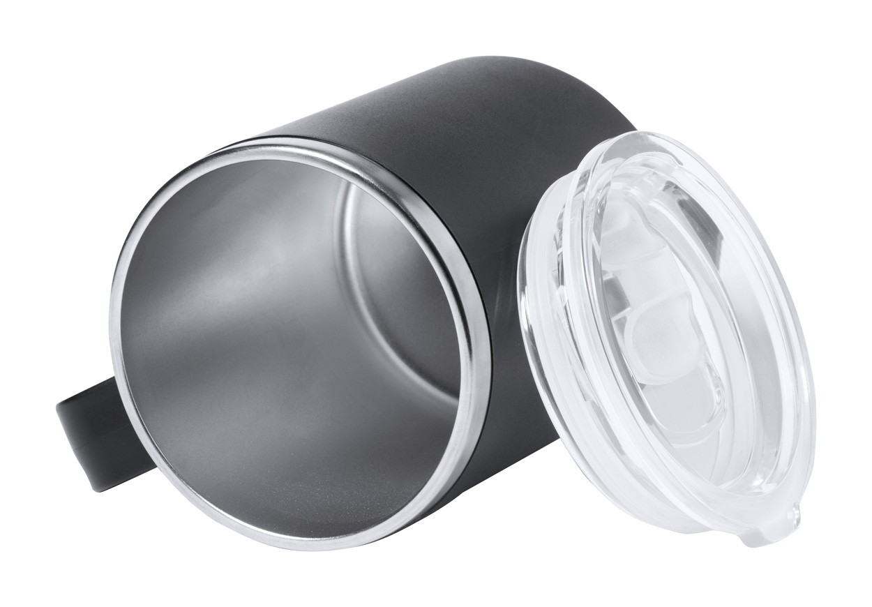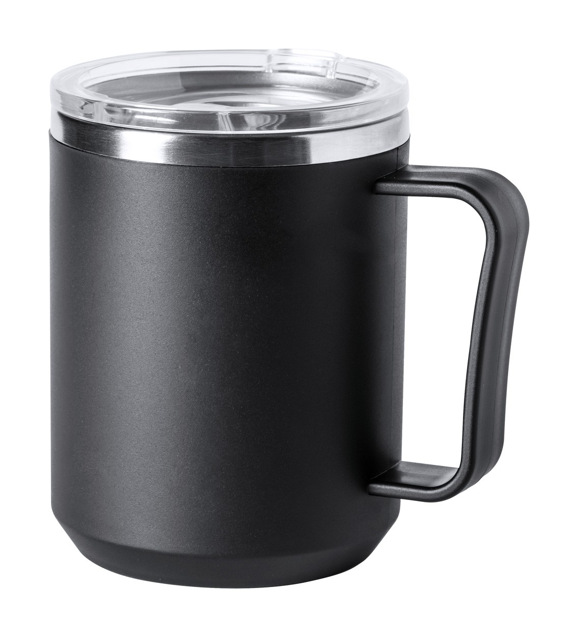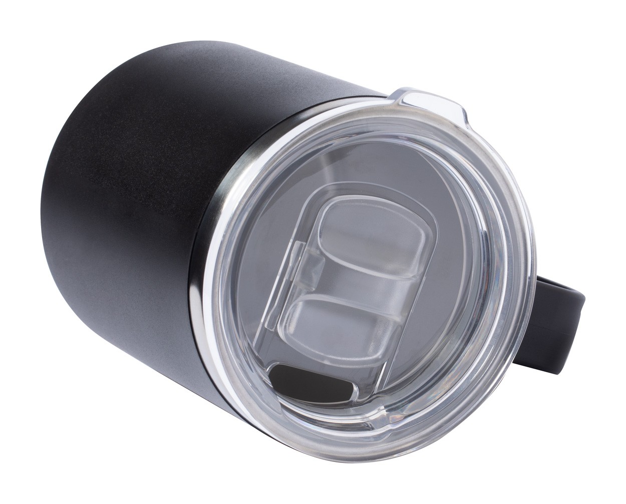 Cană termică cu perete dublu, din oțel inoxidabil, cu mâner și capac transparent pentru băut, din plastic PP. 350 ml. Izolația menține băuturile calde timp de 2 ore și reci timp de 4 ore.