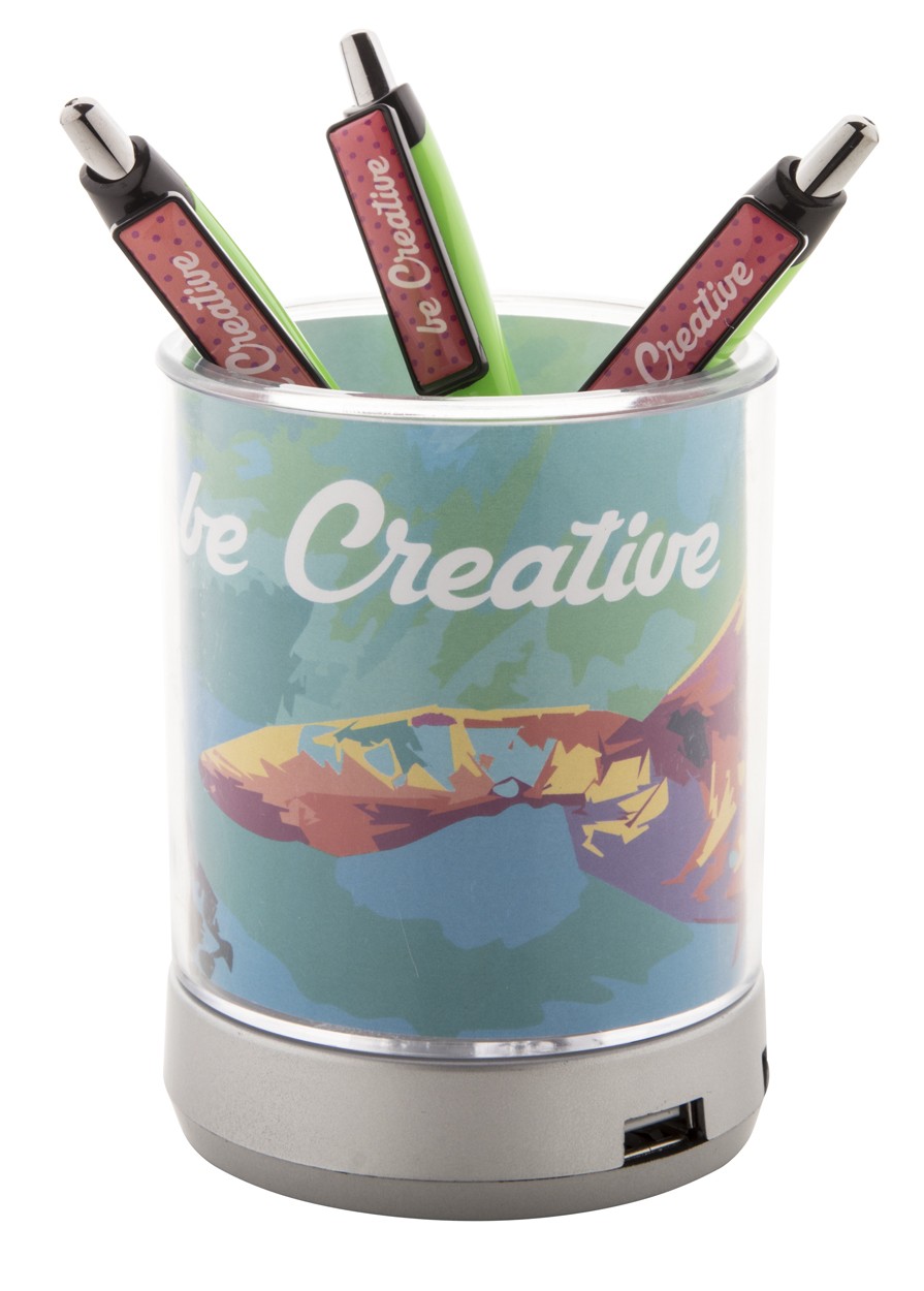 Suport pix cu 4 ieşiri USB (2.0), cu lumină albastră și perete dublu. Între pereţi se poate introduce o grafică personalizată. Material: ABS.