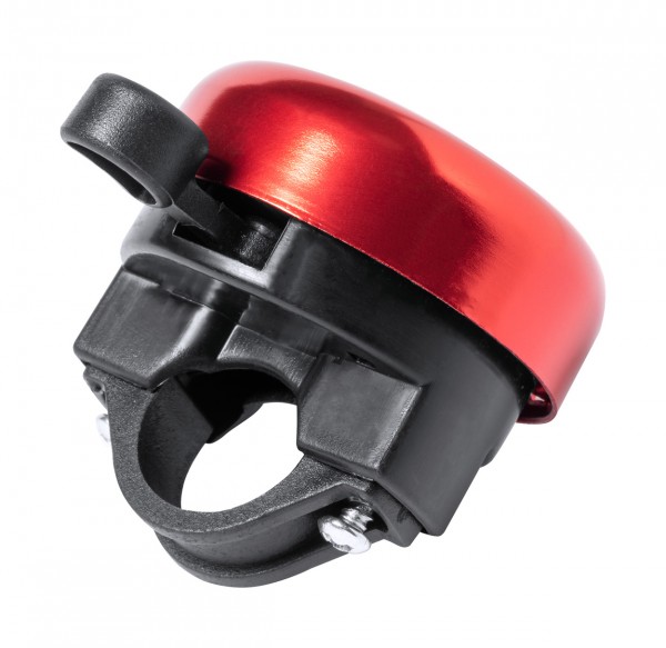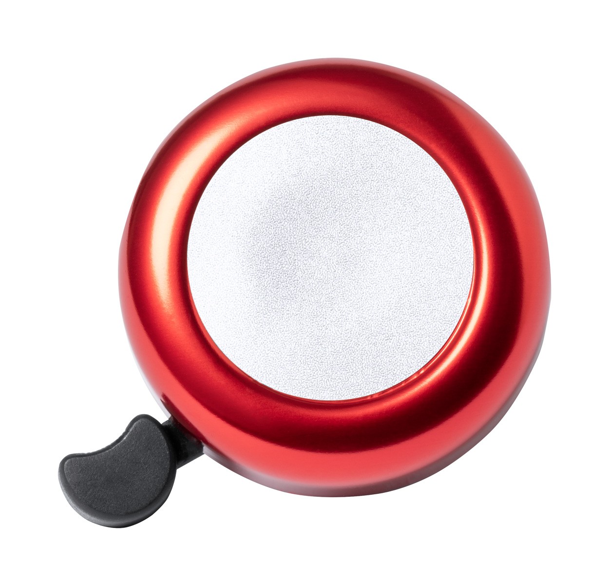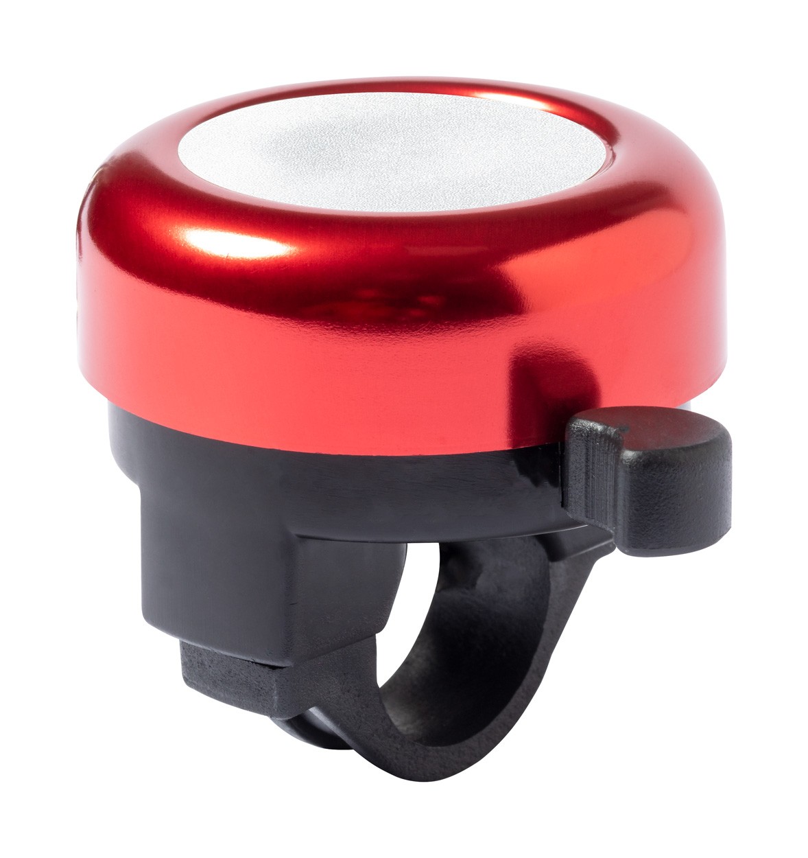 Claxon pentru bicicletă, din aluminiu, cu placă argintie și finisaj lucios.