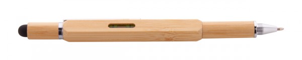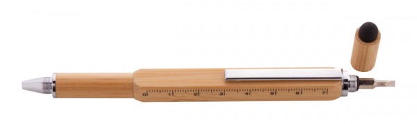 Pix multifuncțional, cu deschidere prin răsucire și capăt tactil, din bambus. Cu vârf de șurubelniță dublu, boloboc și riglă de 7 cm. Cu mină albastră.