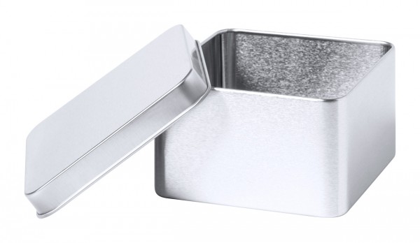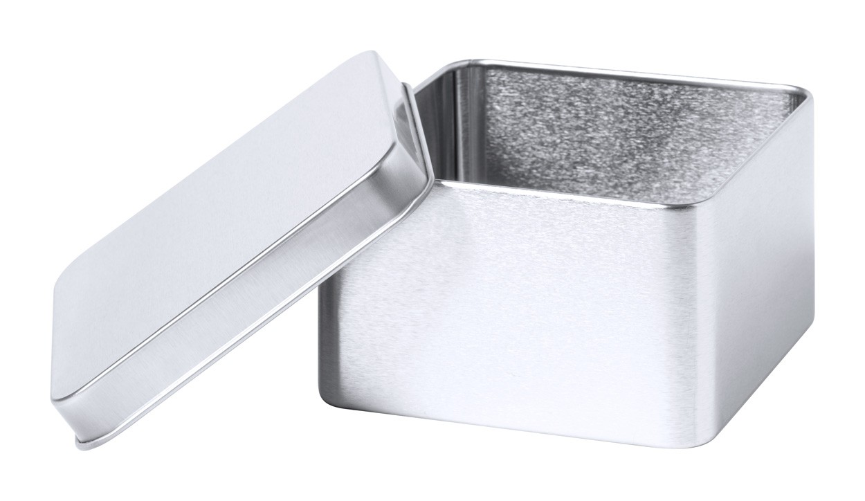 Cutie cadou pătrată, din metal, cu finisaj argintiu.