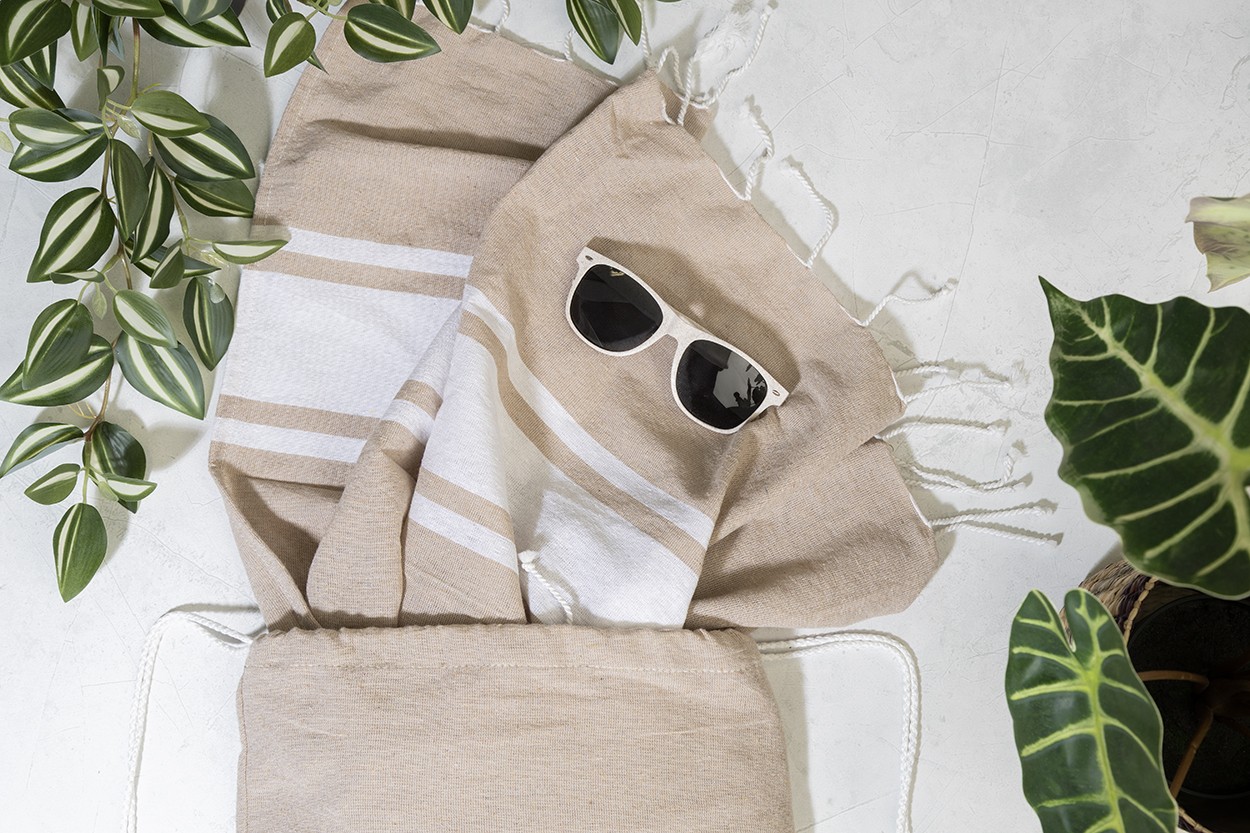 Prosop de plajă pareo, în două culori, cu sac integrat cu șnur. 70% bumbac reciclat și 30% poliester RPET, 180 g/m².