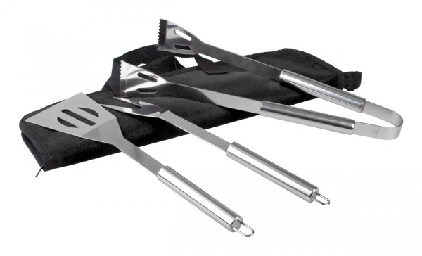 Set pentru grătar, conţine 3 accesorii: 1 furculiţă, 1 paletă şi 1 cleşte din oţel inoxidabil. Gentă din nailon, cu fermoar.