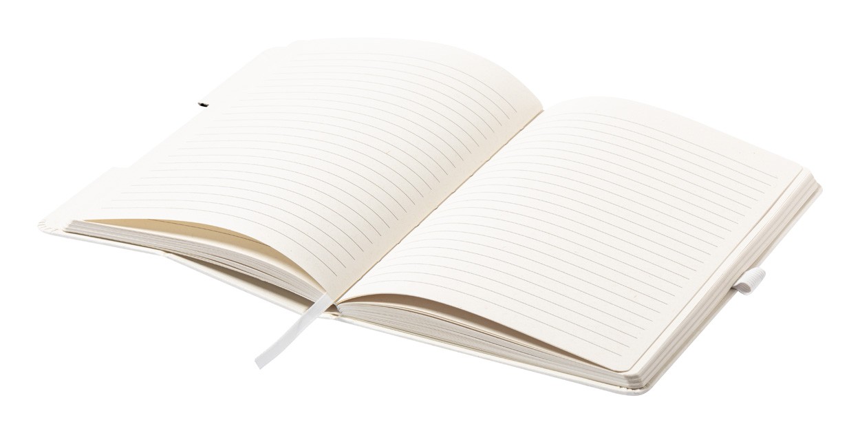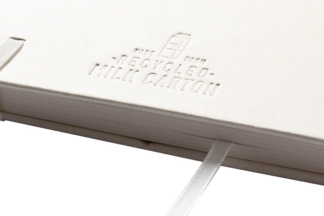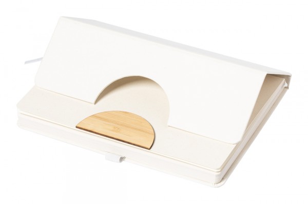 Agendă acoperită cu carton provenit din reciclarea cutiilor de lapte, cu inserție din bambus, curea de cauciuc, marcaj și funcție de suport pentru telefon mobil. Cu 100 de foi dictando.