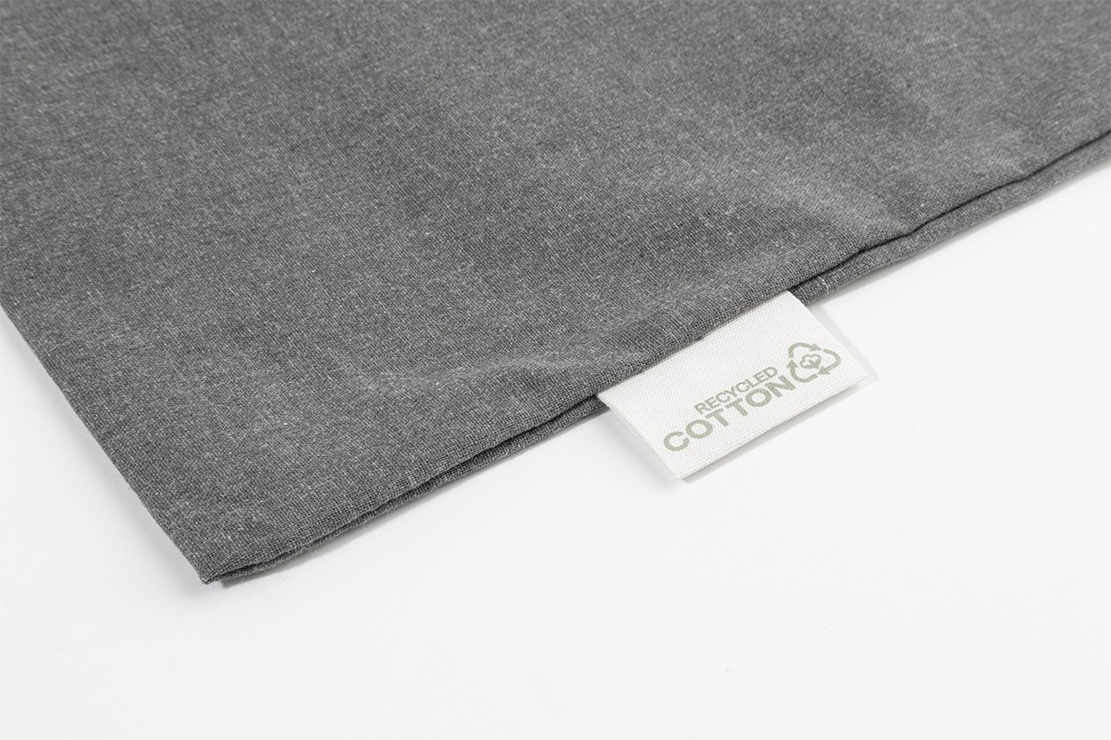 Sacoșă de cumpărături, cu mânere lungi, din 70% bumbac reciclat și 30% poliester RPET, 140 g/m². Cu etichetă distinctivă din bumbac reciclat.