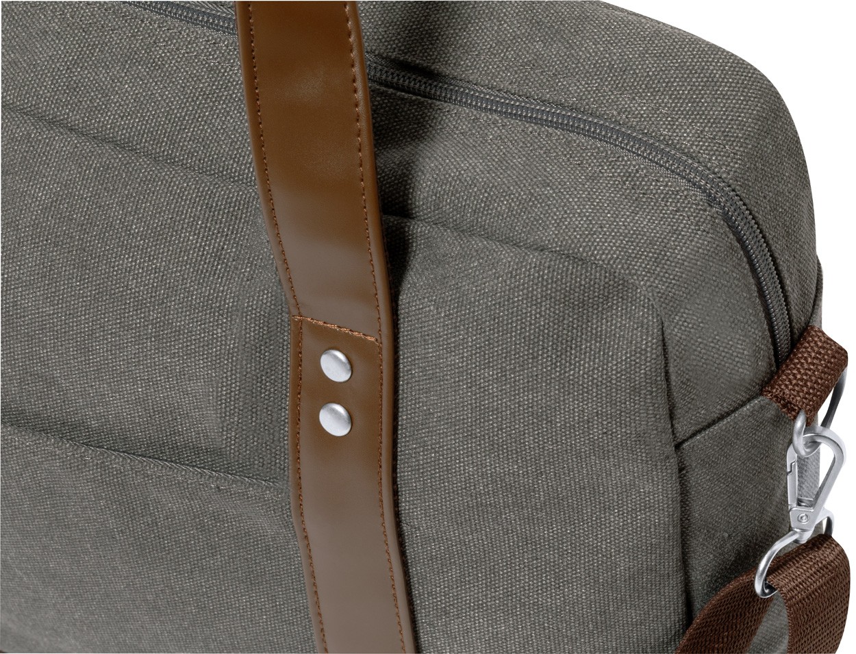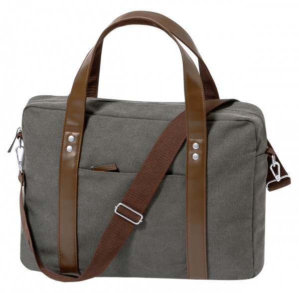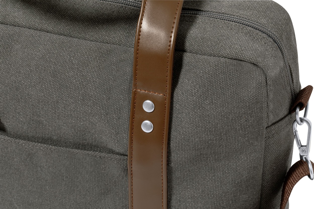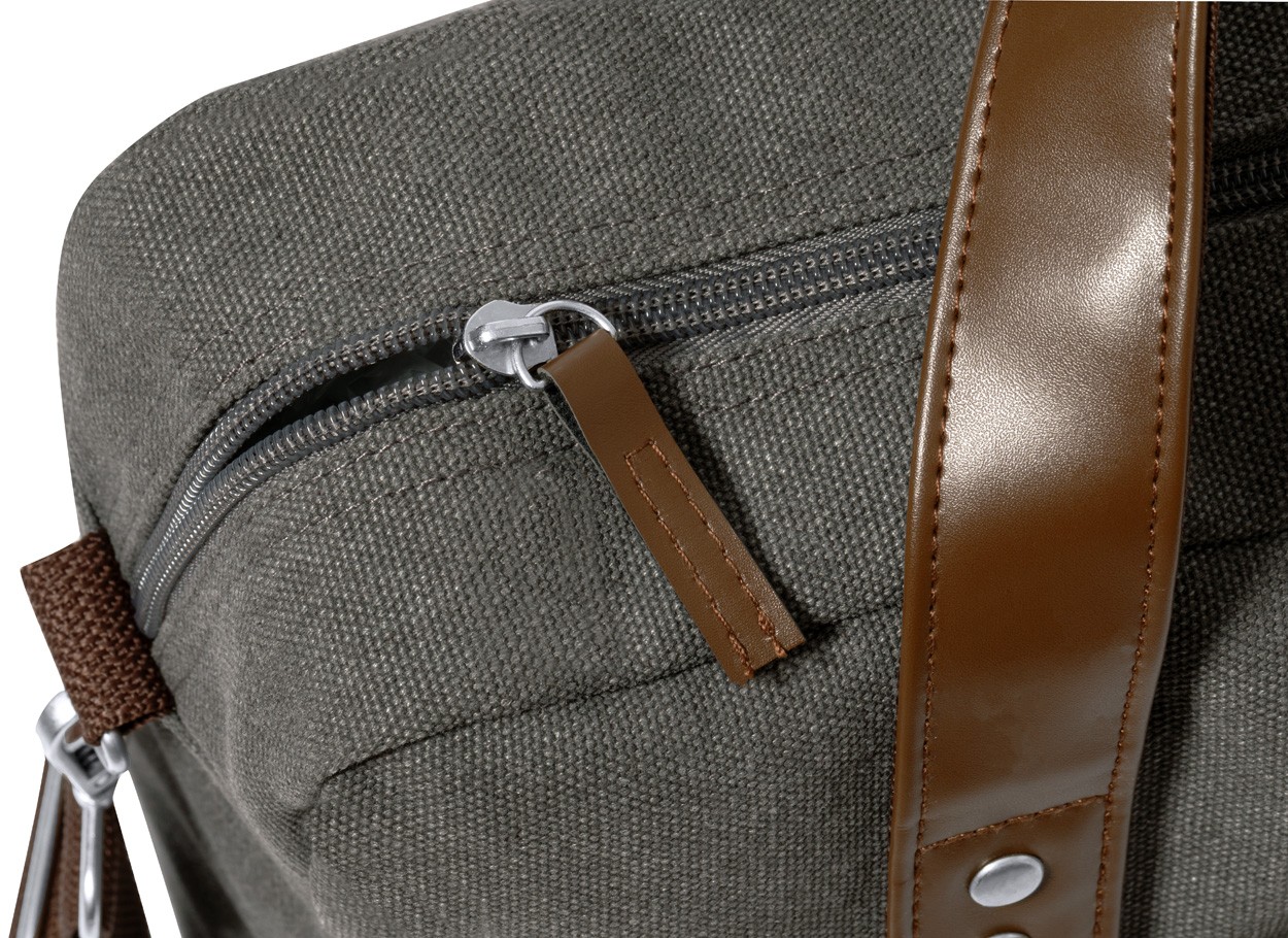 Geantă din pânză, pentru documente, cu compartiment principal cu fermoar și buzunar frontal. Cu compartiment capitonat pentru laptop (15") și tabletă (10"), curea de umăr reglabilă, detalii și mânere din piele PU.