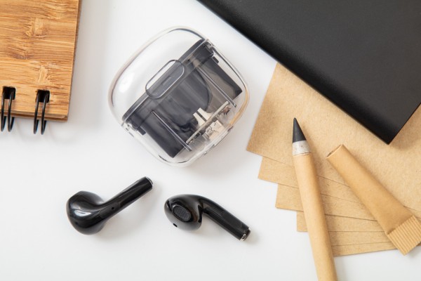 Căști adevărate stereo fără fir (TWS) din plastic ABS reciclat, cu funcție de apelare mâini libere, în carcasă transparentă pentru încărcător. Inclusiv cablu de încărcare USB.