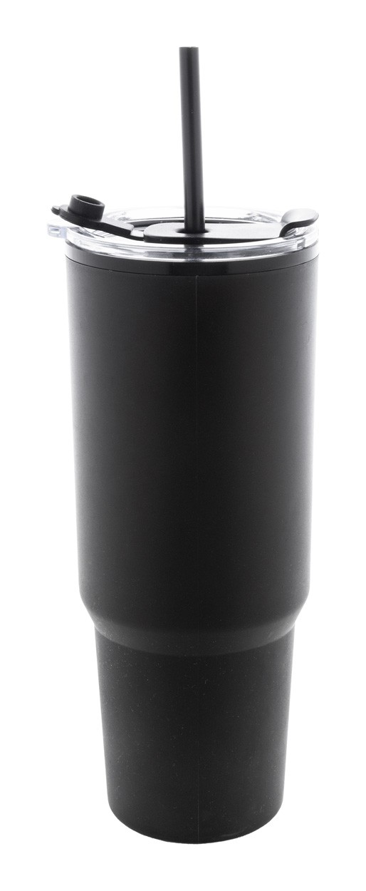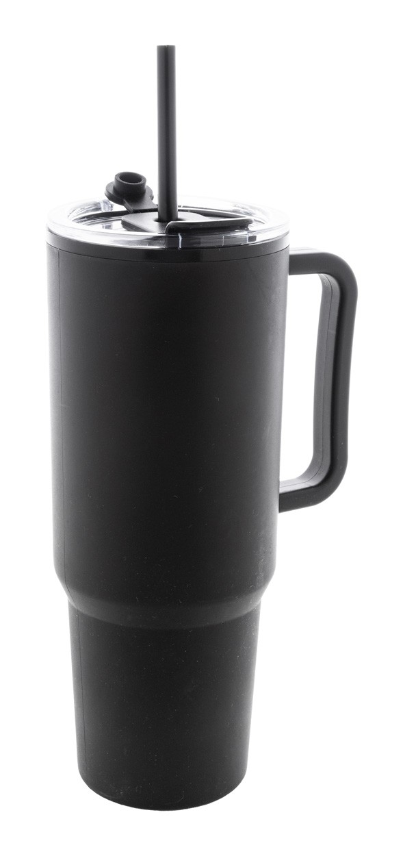 Cană termoizolată din plastic PP, cu perete dublu, cu capac de băut și pai. 1100 ml.