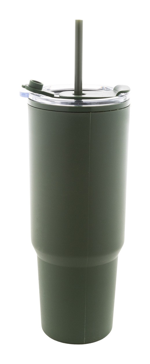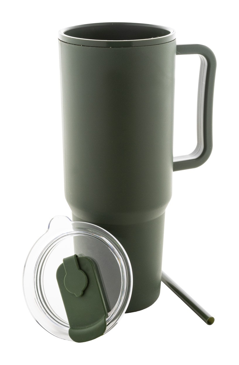 Cană termoizolată din plastic PP, cu perete dublu, cu capac de băut și pai. 1100 ml.