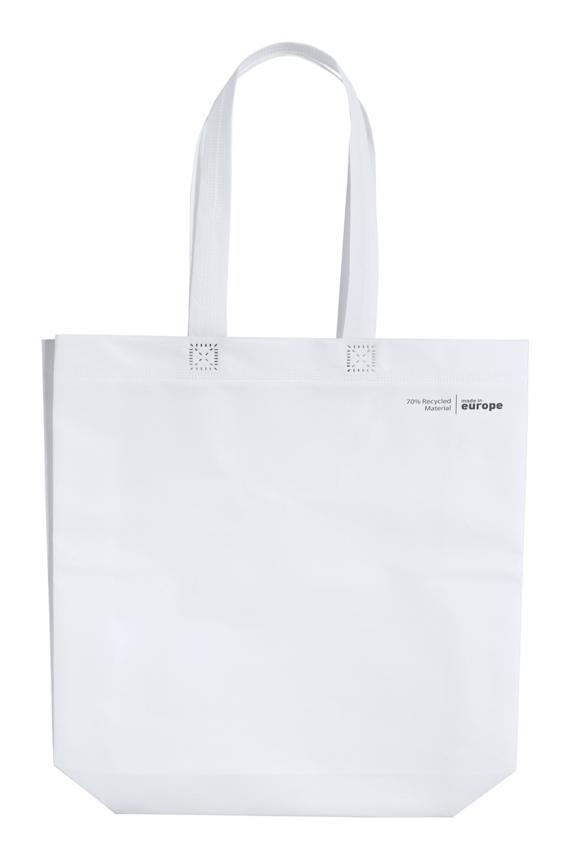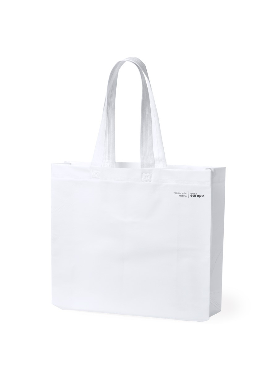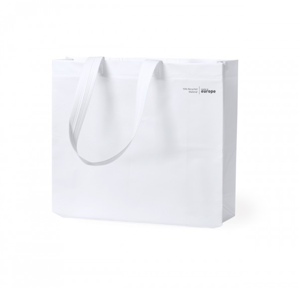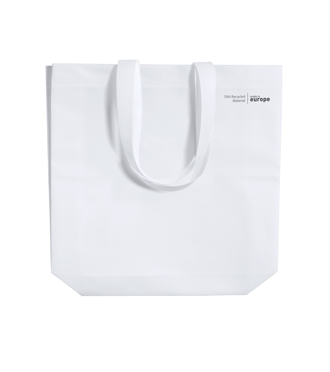 Sacoșă de cumpărături, din material nețesut laminat, cu burduf, mânere lungi și finisaj termosigilat, 120 g/m². Fabricat din material 70% reciclat.