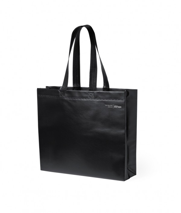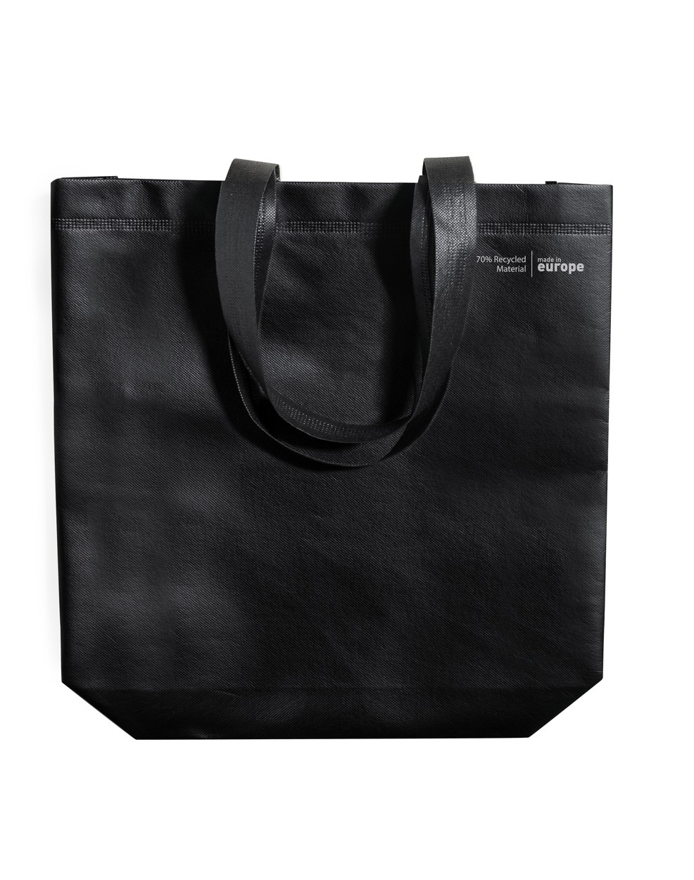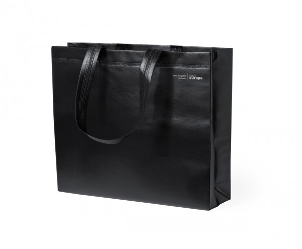 Sacoșă de cumpărături, din material nețesut laminat, cu burduf, mânere lungi și finisaj termosigilat, 120 g/m². Fabricat din material 70% reciclat.
