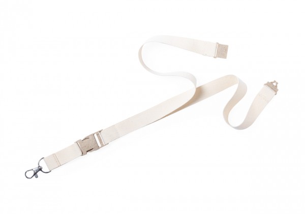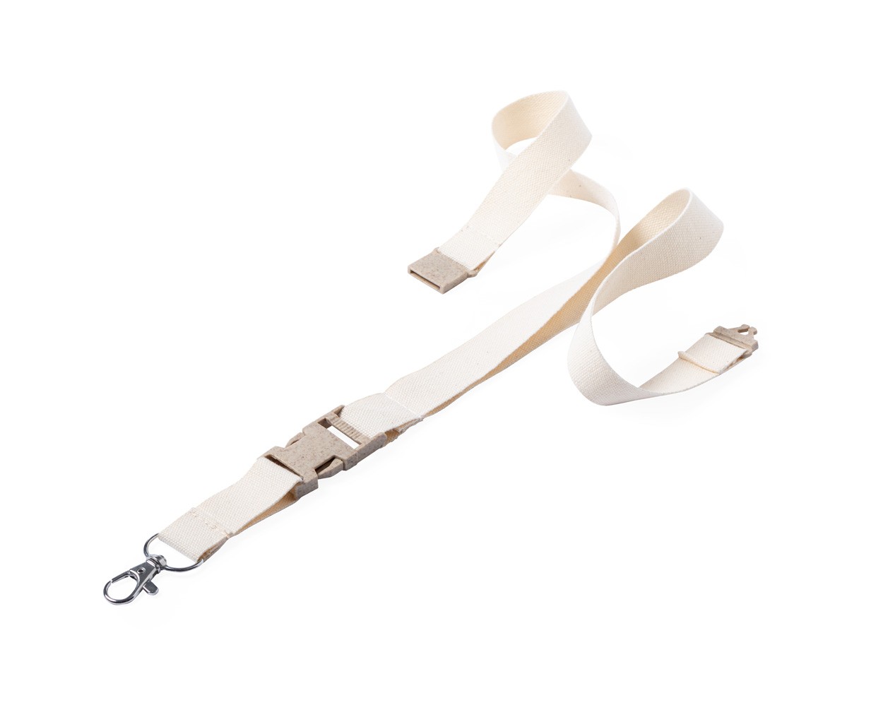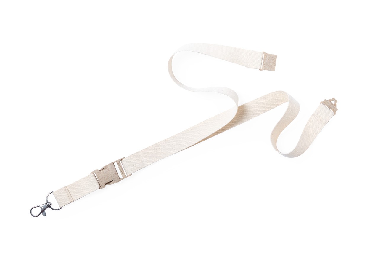Lanyard din bumbac, cu carabină detașabilă din metal și cataramă de siguranță. Catarama este de plastic din paie de grâu.