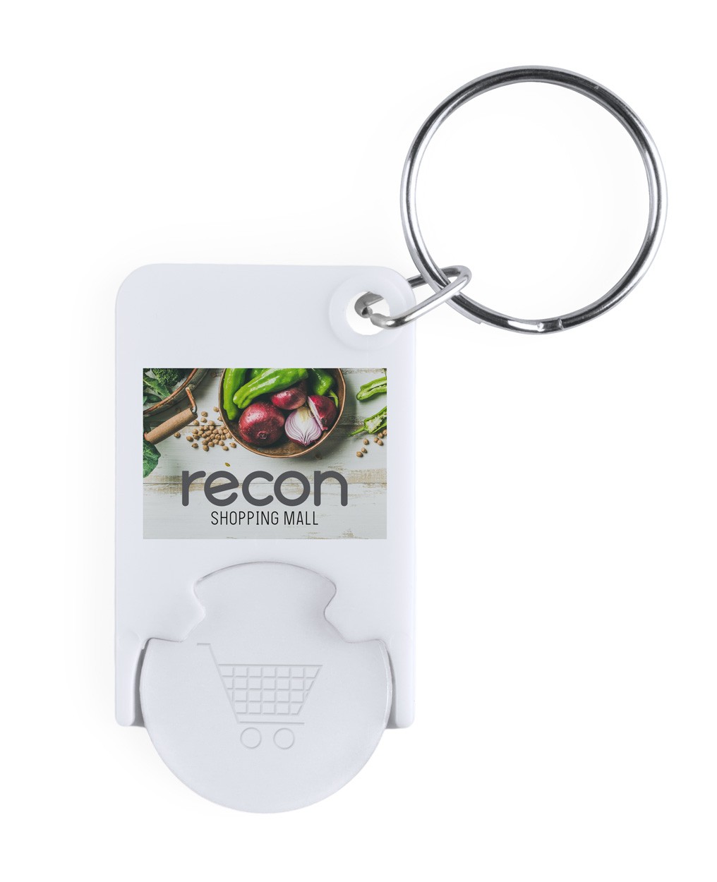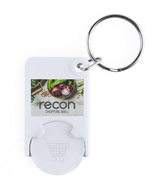 Breloc din plastic cu fisă pentru cumpărături, cu inel metalic.