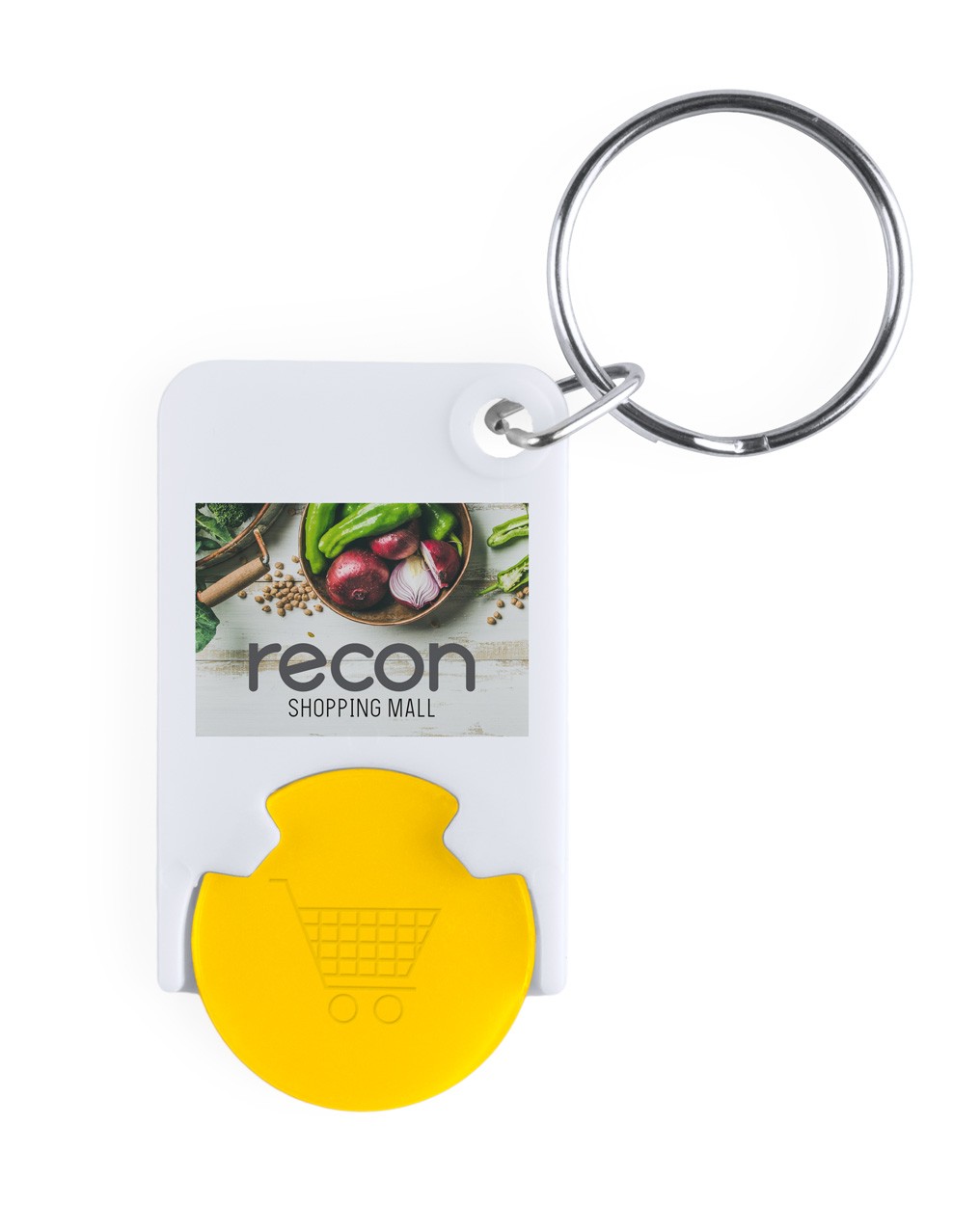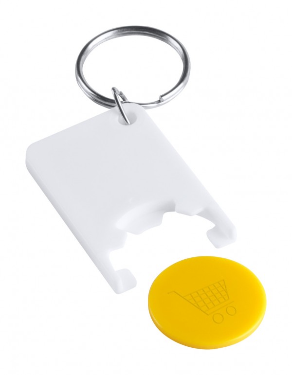 Breloc din plastic cu fisă pentru cumpărături, cu inel metalic.