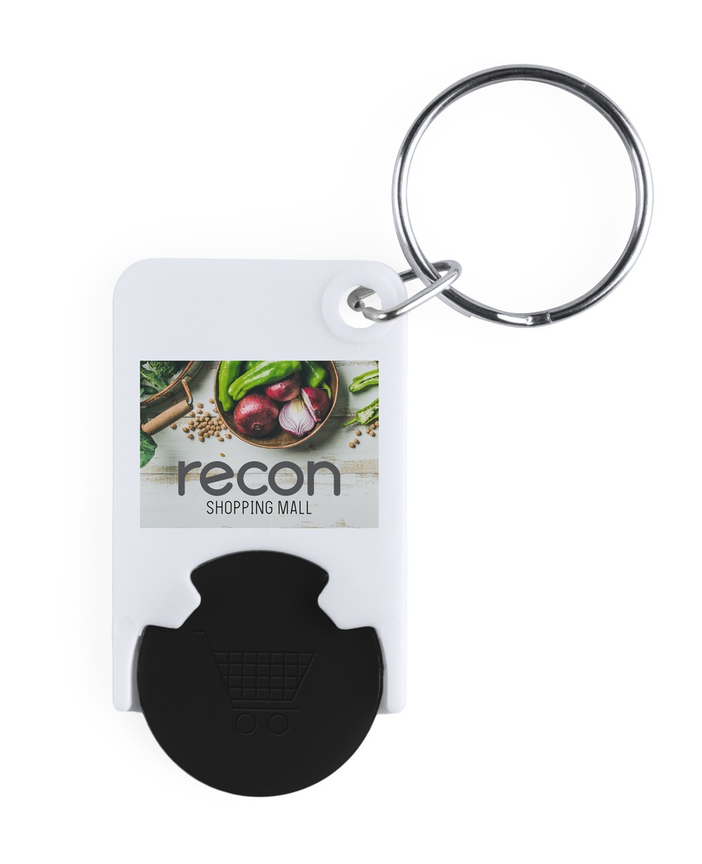 Breloc din plastic cu fisă pentru cumpărături, cu inel metalic.