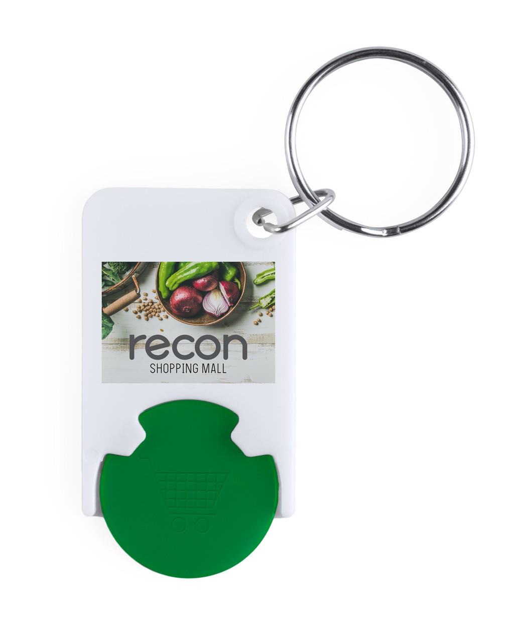 Breloc din plastic cu fisă pentru cumpărături, cu inel metalic.